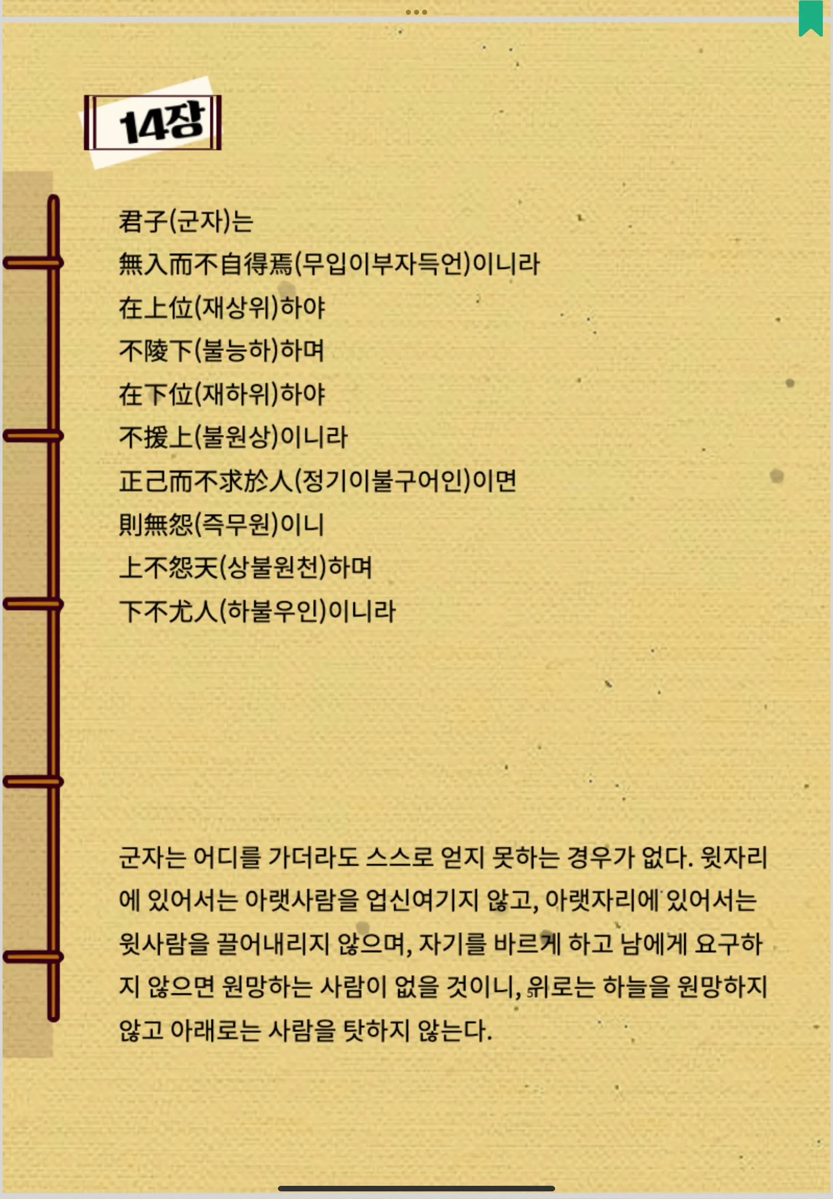 중용은 어느 한 쪽에 치우치지 않는 것, 과하면서도 동시에 모자람이 없는 것을 의미한다. 그렇다면, 치우친 것은 무엇인가? 무엇을 과하다고 말하며, 무엇을 모자라다고 말할까? 이에 대한 명쾌하고 구체적인 정답은 없다. 그저 매순간 자신을 돌아보며, 지금 중간의 위치에 있는지 판단해야 한다. 이런 관점에서 중용의 정수는 ”자신의 위치를 돌아보는 행위“, 그 자체에 있는게 아닐까?