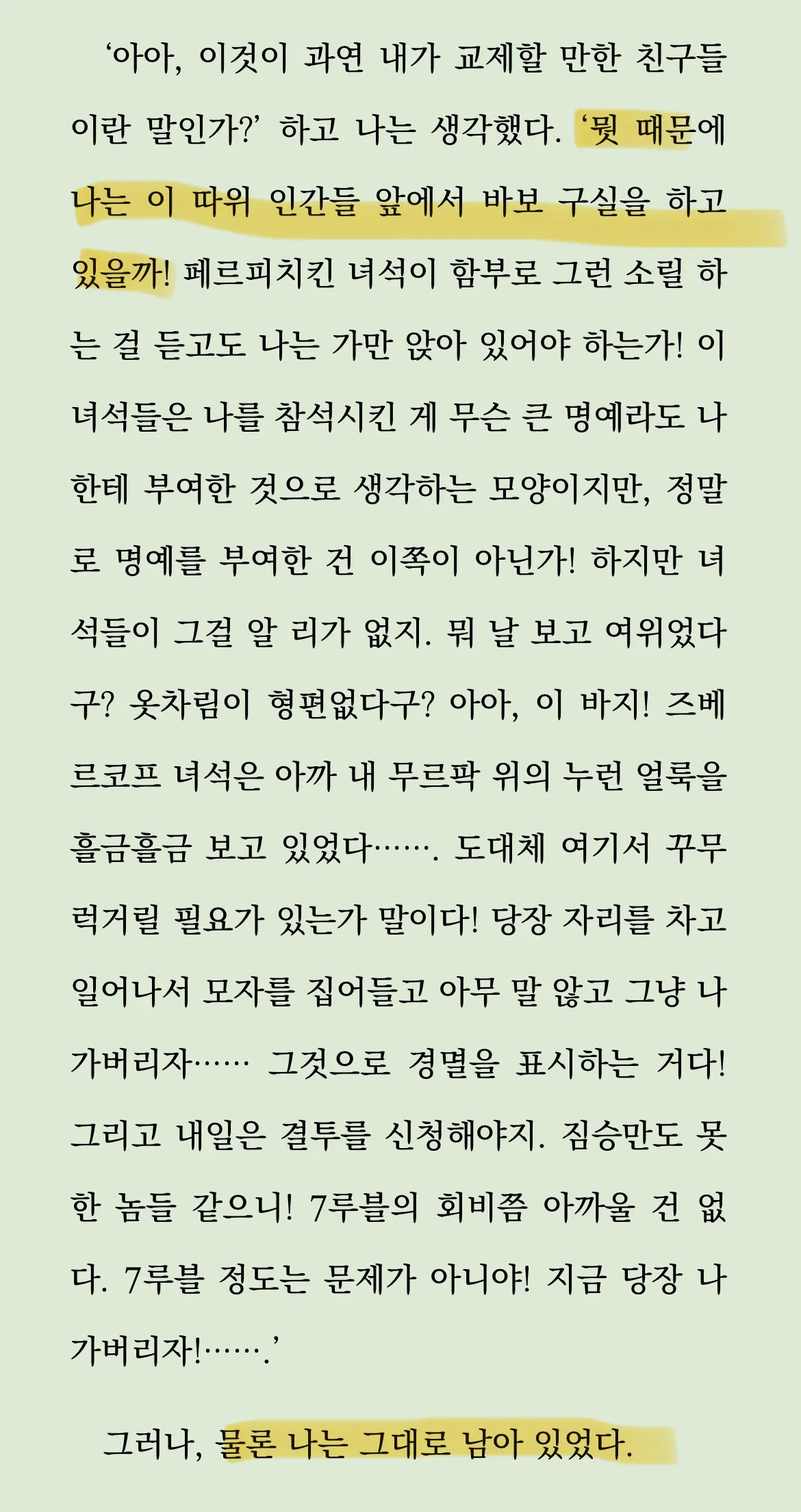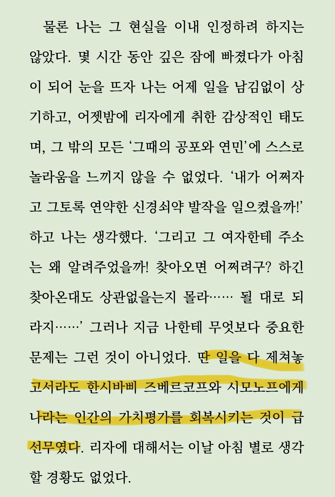 딴 일을 다 제쳐놓고서라도 한시바비 즈베르코프와 시모노프에게 나라는 인간의 가치평가를 회복시키는 것이 급선무였다.