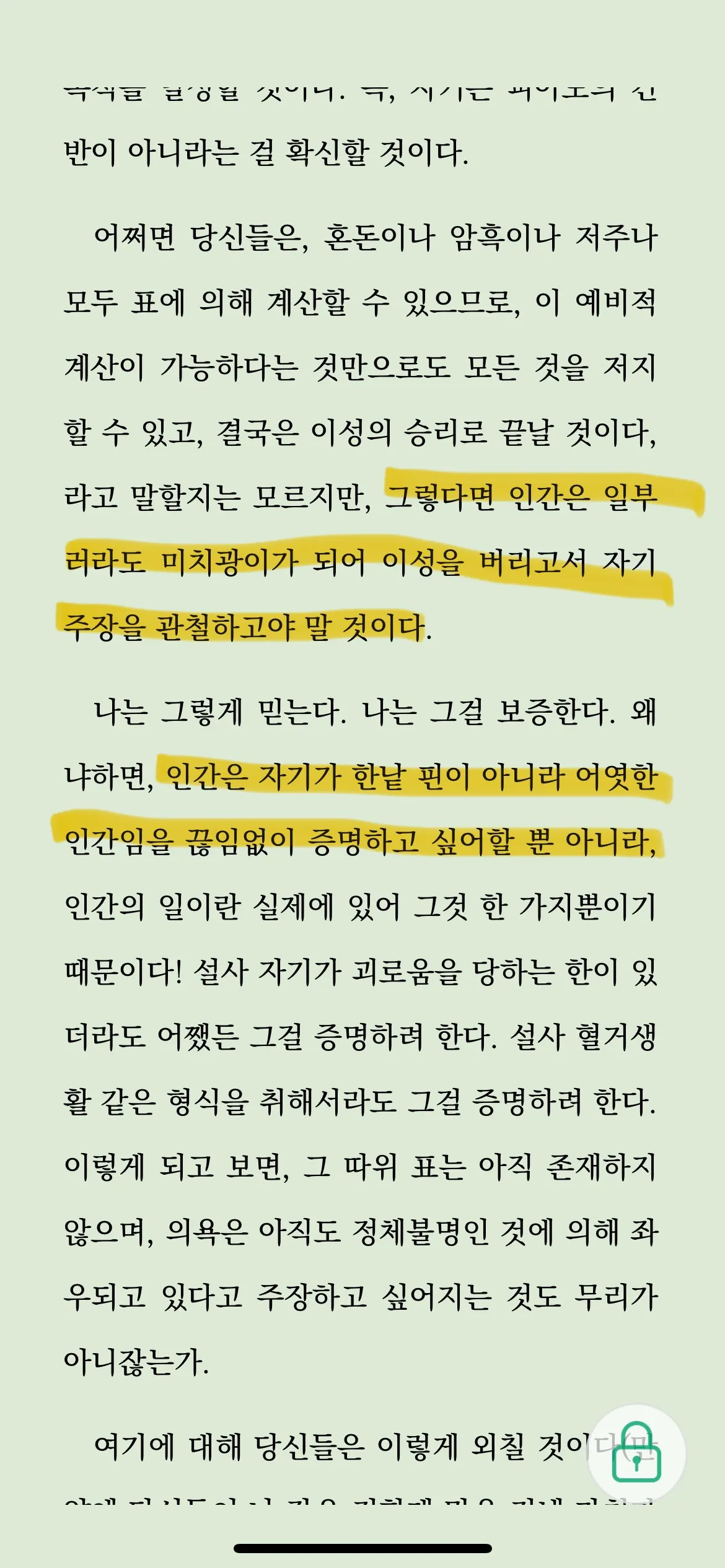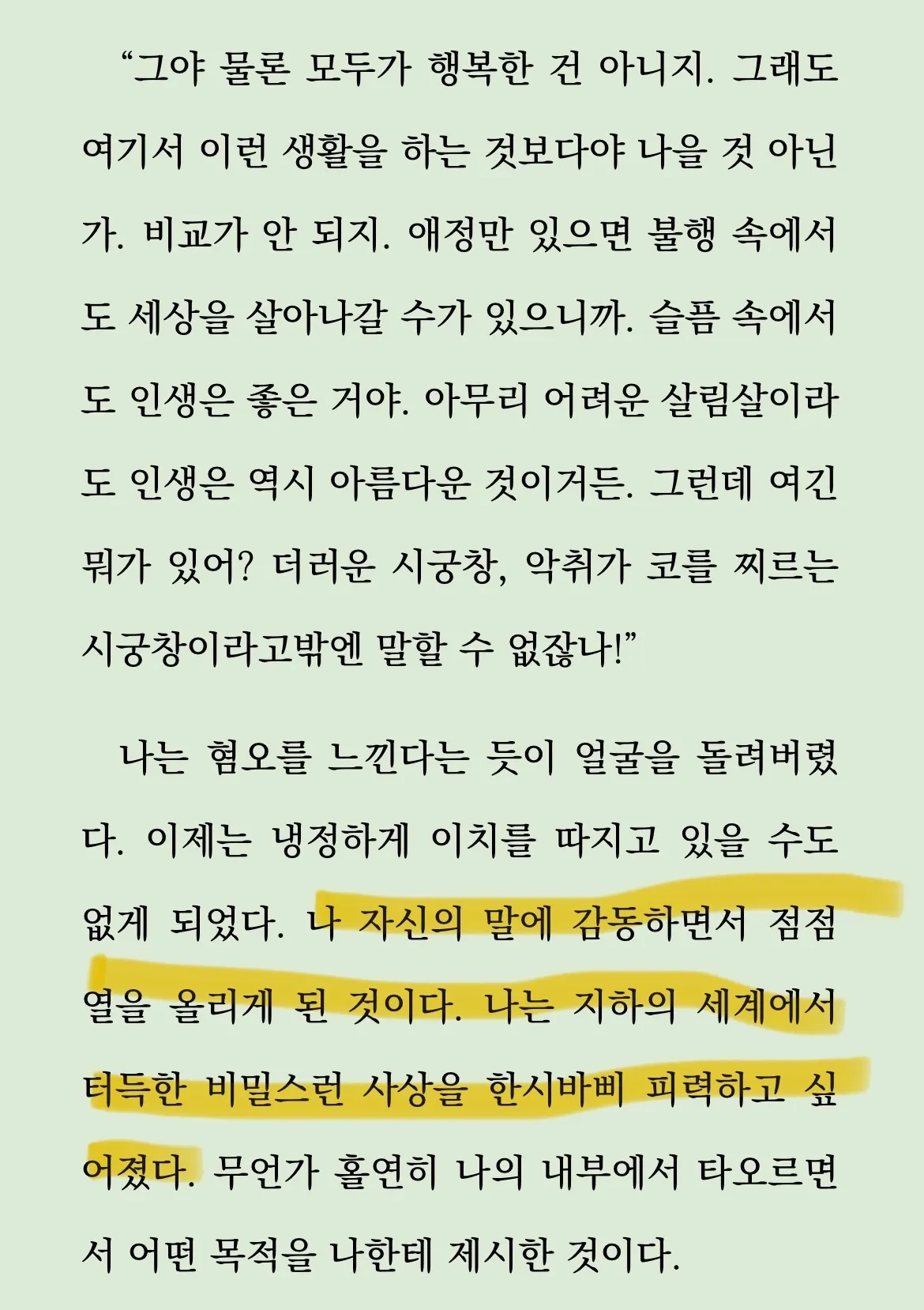 나 자신의 말에 감동하면서 점점 열을 올리게 된 것이다. 나는 지하의 세계에서 터득한 비밀스런 사상을 한시바삐 피력하고 싶어졌다. 무언가 홀연히 나의 내부에서 타오르면서 어떤 목적을 나한테 제시한 것이다.