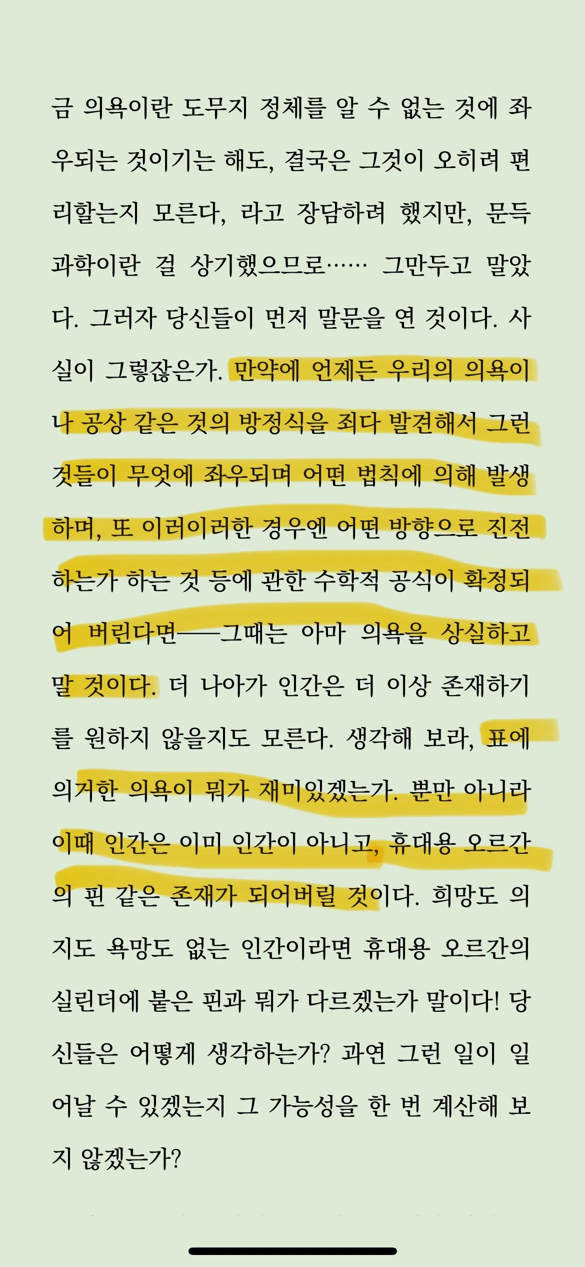 우리의 모든 행동과 생각을 수학 공식처럼 정의할 수 있다면, 우리는 자유 의지를 가지고 살아 숨쉬는 인간이 아니게 된다. 그저 특정한 로직에 의해 동작이 통제되는 로봇과 다를 바가 없다. 그렇기에 비이성은 인간다움의 특징이다.