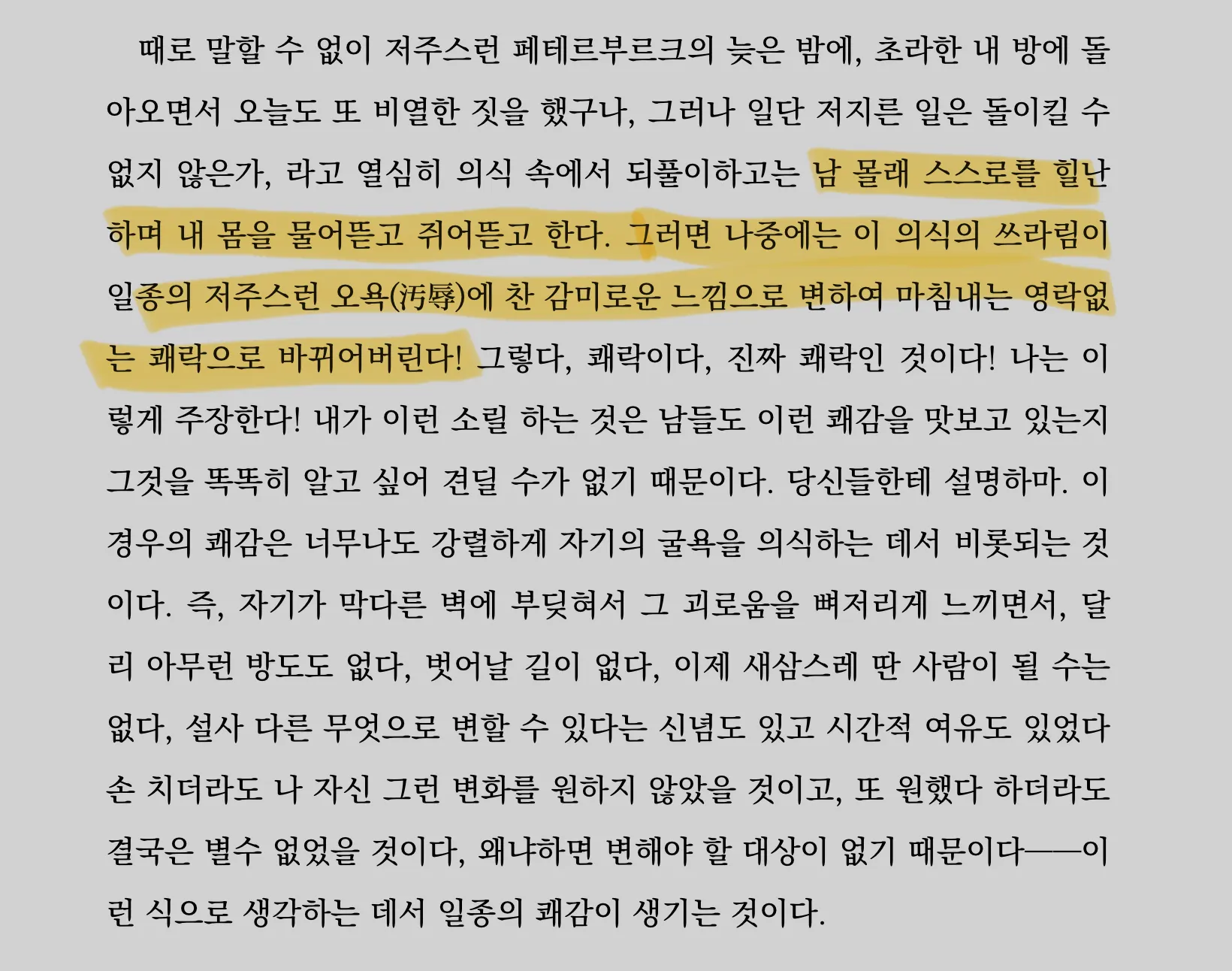 나중에는 이 의식의 쓰라림이 일종의 저주스런 오욕에 찬 감미로운 느낌으로 변하여 마침내는 영락 없는 쾌락으로 바뀌어버린다! 그렇다, 쾌락이다, 진짜 쾌락인 것이다!