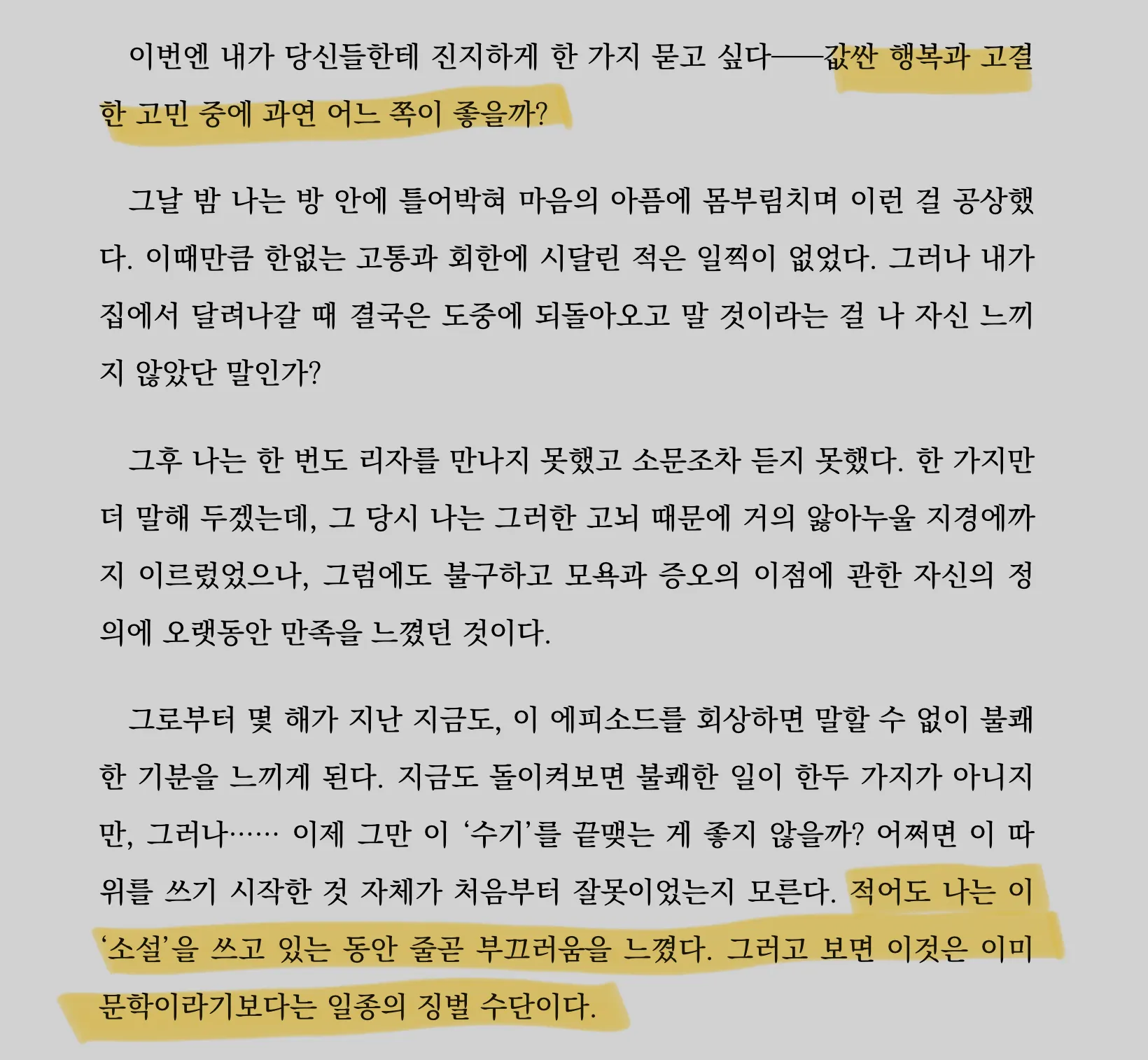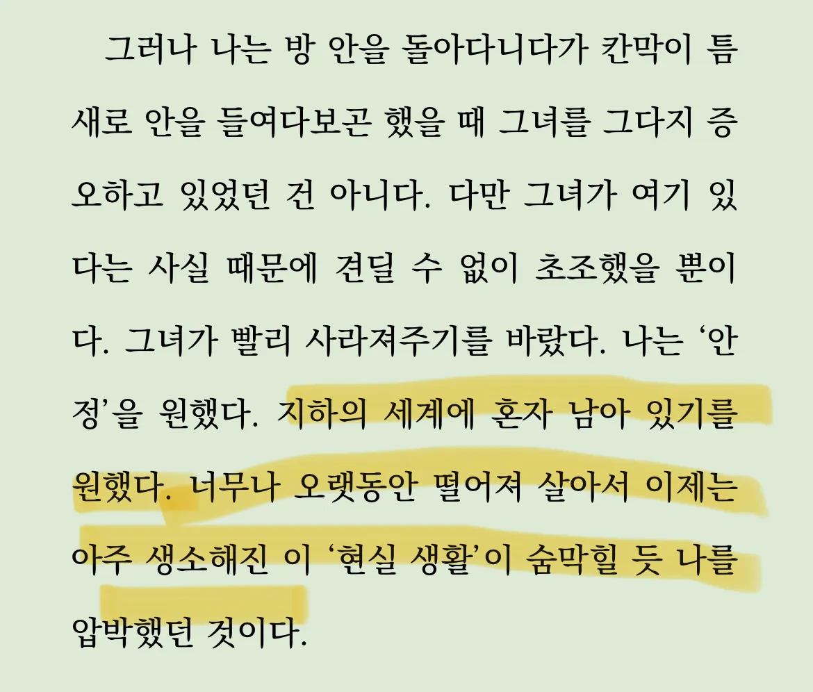 나는 '안정'을 원했다. 지하의 세계에 혼자 남아 있기를 원했다. 너무나 오랫동안 떨어져 살아서 이제는 아주 생소해진 이 '현실 생활'이 숨막힐 듯 나를 압박했던 것이다.