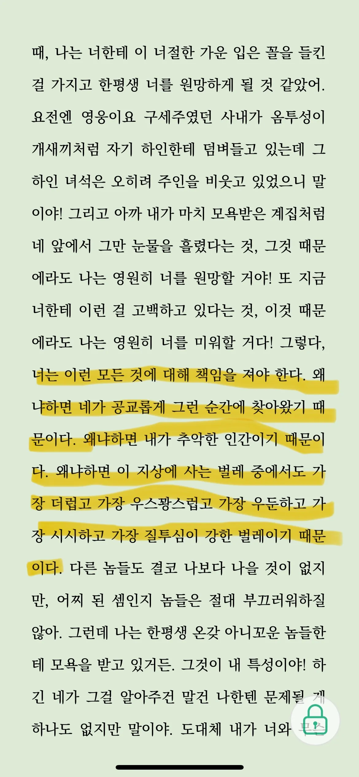 현실과 공상의 차이가 클수록, 공상이 ’나‘에게 가져다 주는 안정과 행복은 더 달콤하게 느껴진다. 이 달콤함에 의해 공상에 중독되고, 결국 공상이 없으면 버티지 못하는 몸이 된다. 우리는 달콤한 공상이 아닌, 씁쓸한 현실을 살아야 함을 잊으면 안 된다. 설령 그것이 슬프고 힘들지라도 말이다. 이것이 진짜 삶이다.