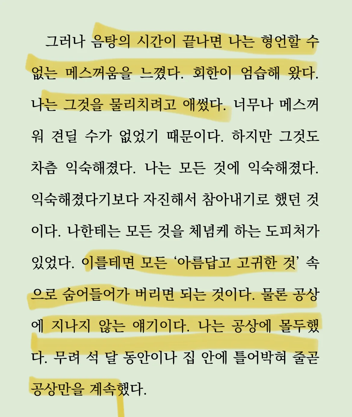 음탕의 시간이 끝나면 나는 형언할 수 없는 메스꺼움을 느꼈다. … 익숙해졌다기보다 자진해서 참아내기로 했던 것이다.