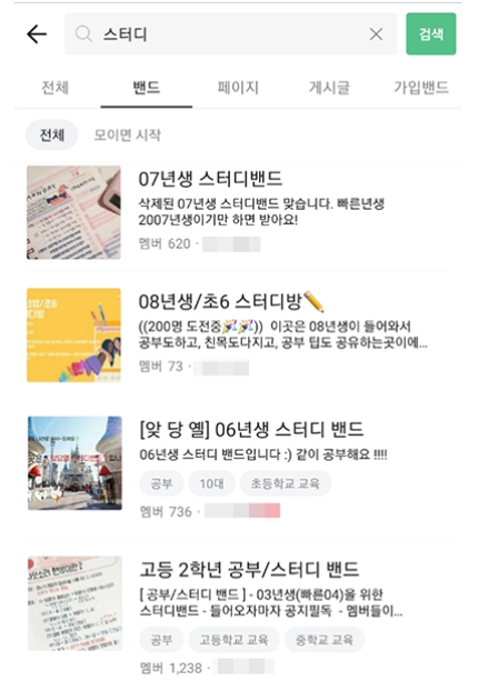 중고등학생 모두 밴드 아이디를 가지고 있음