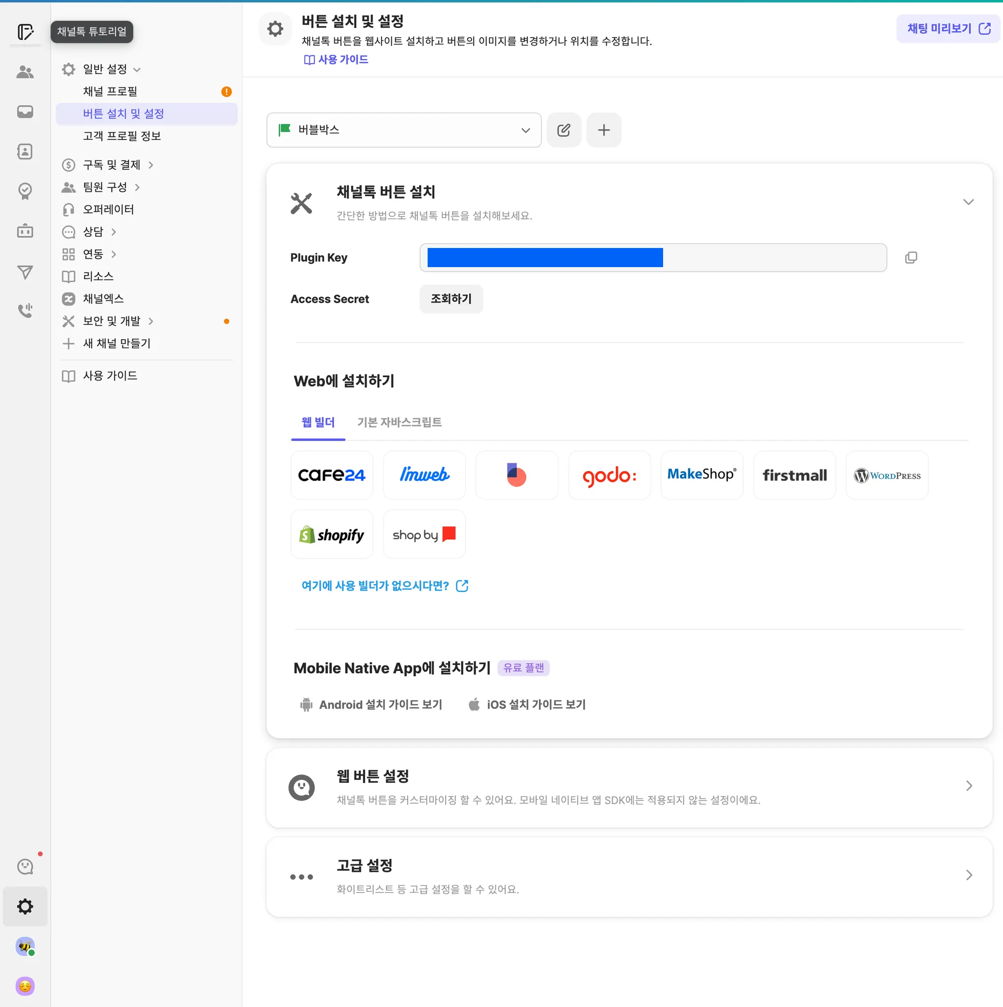 그 다음, [채널톡 버튼 설치]에서 Plugin Key를 확인합니다.