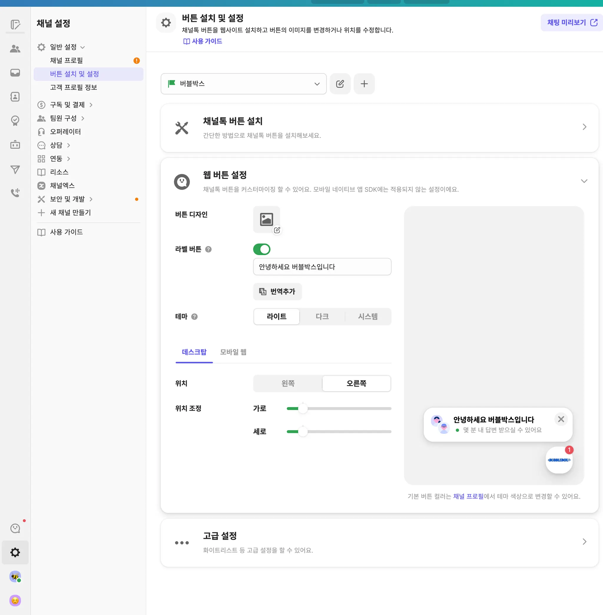 좌측 하단의 [설정] 아이콘을 클릭한 후, [일반 설정] 영역의 [버튼 설치 및 설정]에 들어갑니다. 이후, [웹 버튼 설정]에서 채널톡 버튼을 디자인합니다.