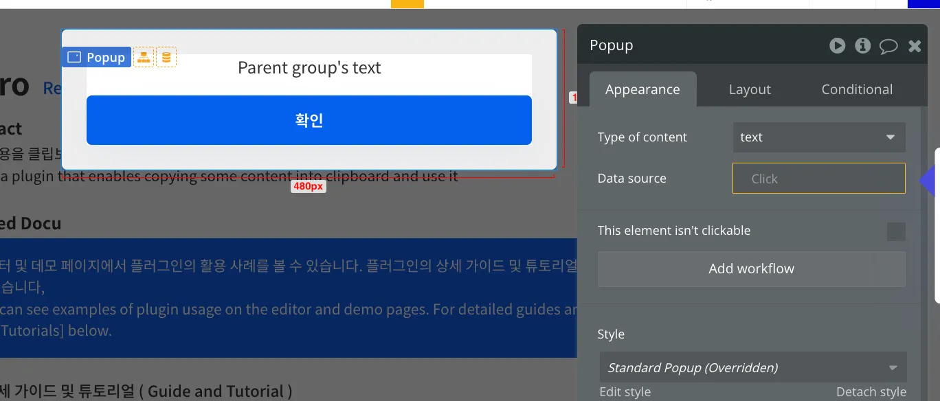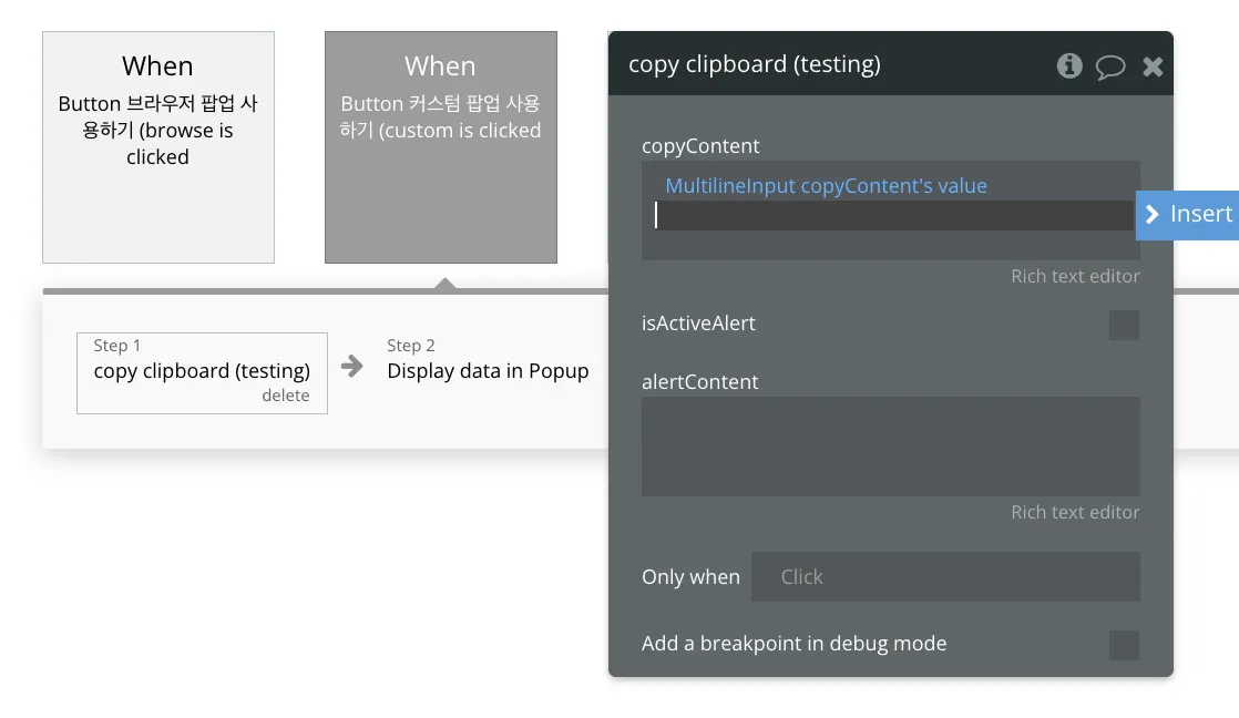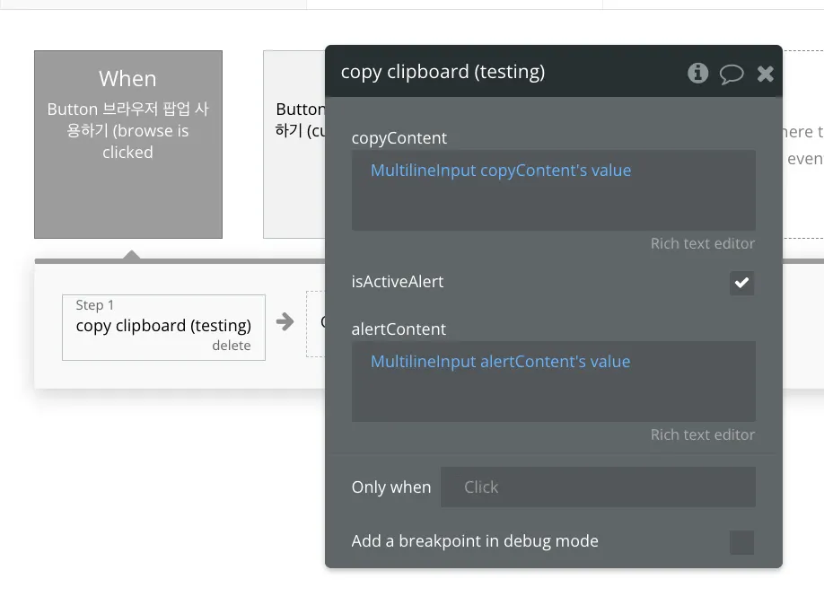 버튼 클릭 시 작동하는 워크플로우를 생성하고, copy clipboard 액션 이벤트를 추가합니다. [copyContent]란에는 복사할 내용을 입력합니다. [isActiveAlert]를 활성화 해서 브라우저의 기본 팝업을 띄우도록 설정하고,[alertContent]란에 팝업에서 보여줄 내용을 입력합니다.