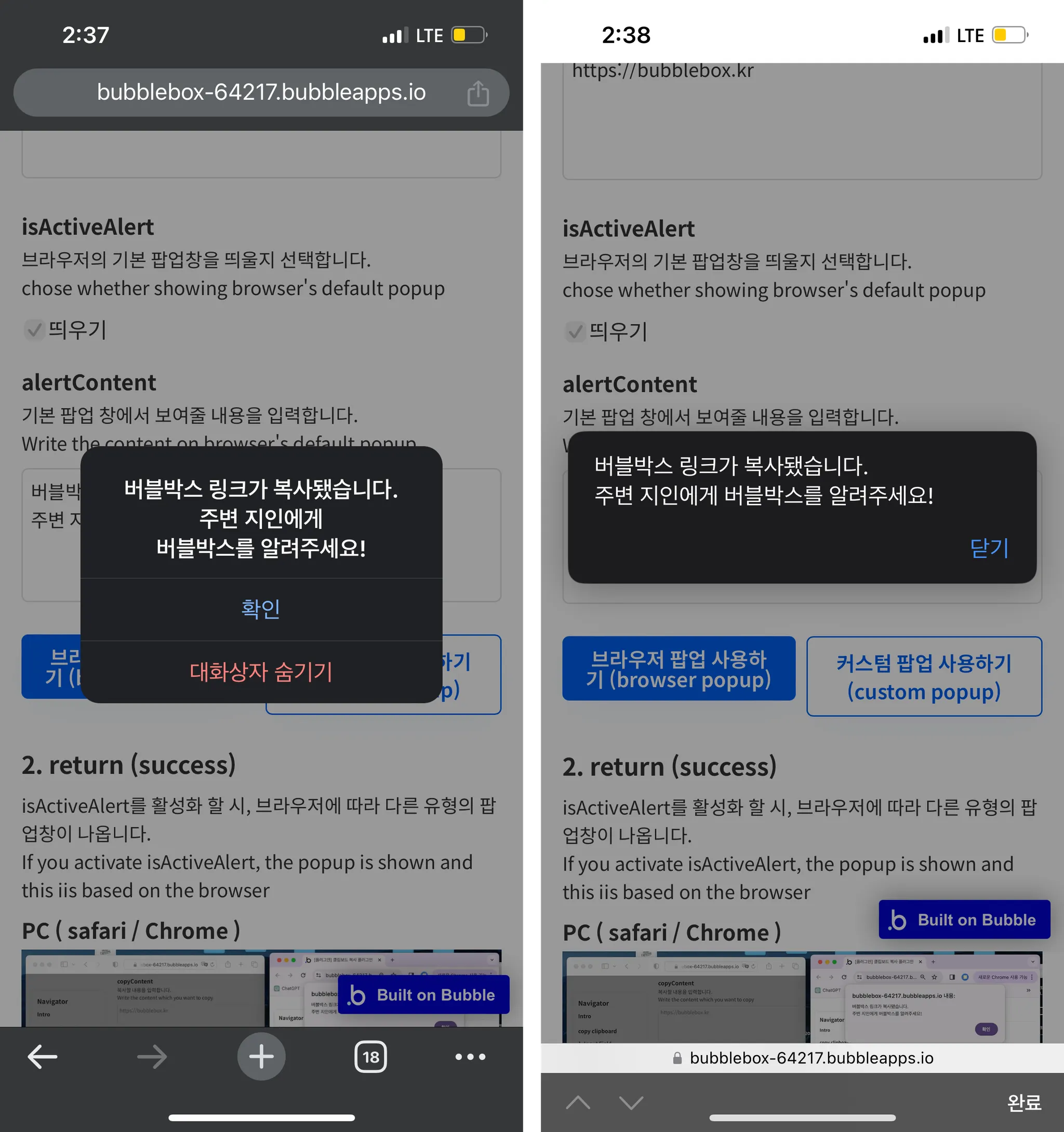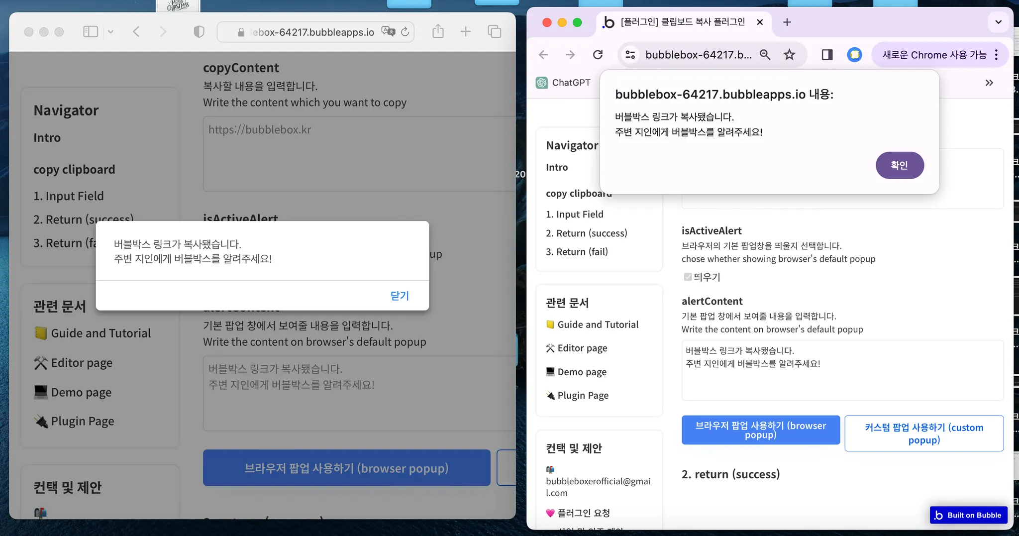 그러면 복사가 완료될 때마다, 브라우저에 맞춰서 팝업이 실행됩니다. 팝업 내용으로 앞선 [alertContent]가 출력됩니다.
