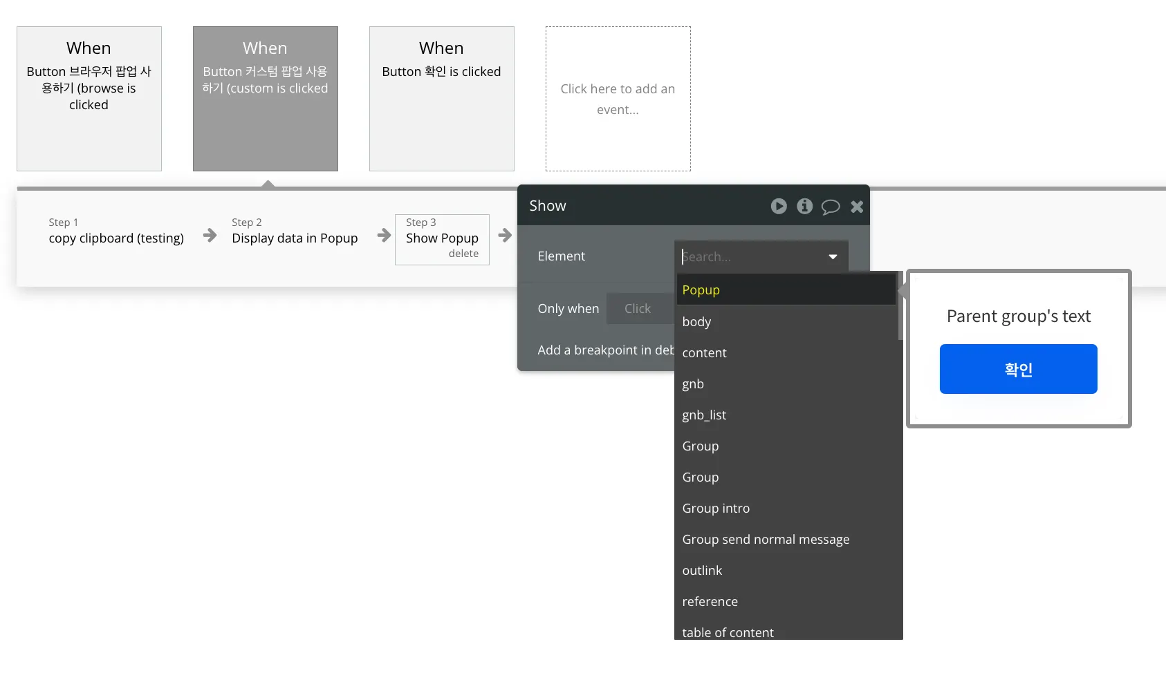 복사 액션 이벤트가 종료된 후, show element 액션 이벤트를 활용해 앞서 생성한 팝업을 출력해 사용하면 됩니다.
