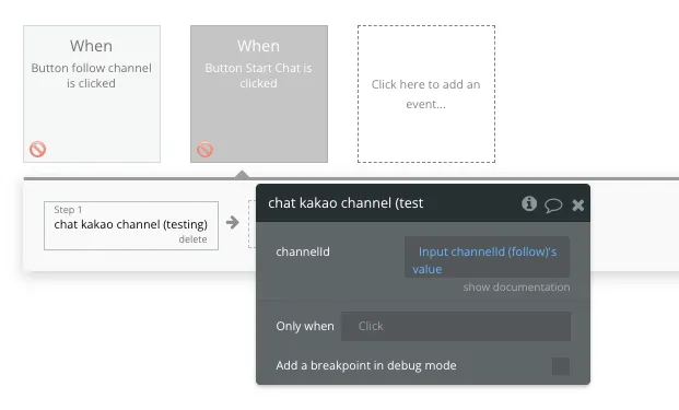 User can chat with Kakao channel in Bubble using the [chat kakao channel] event. Enter the previously connected business channel ID in the [channelId] field.