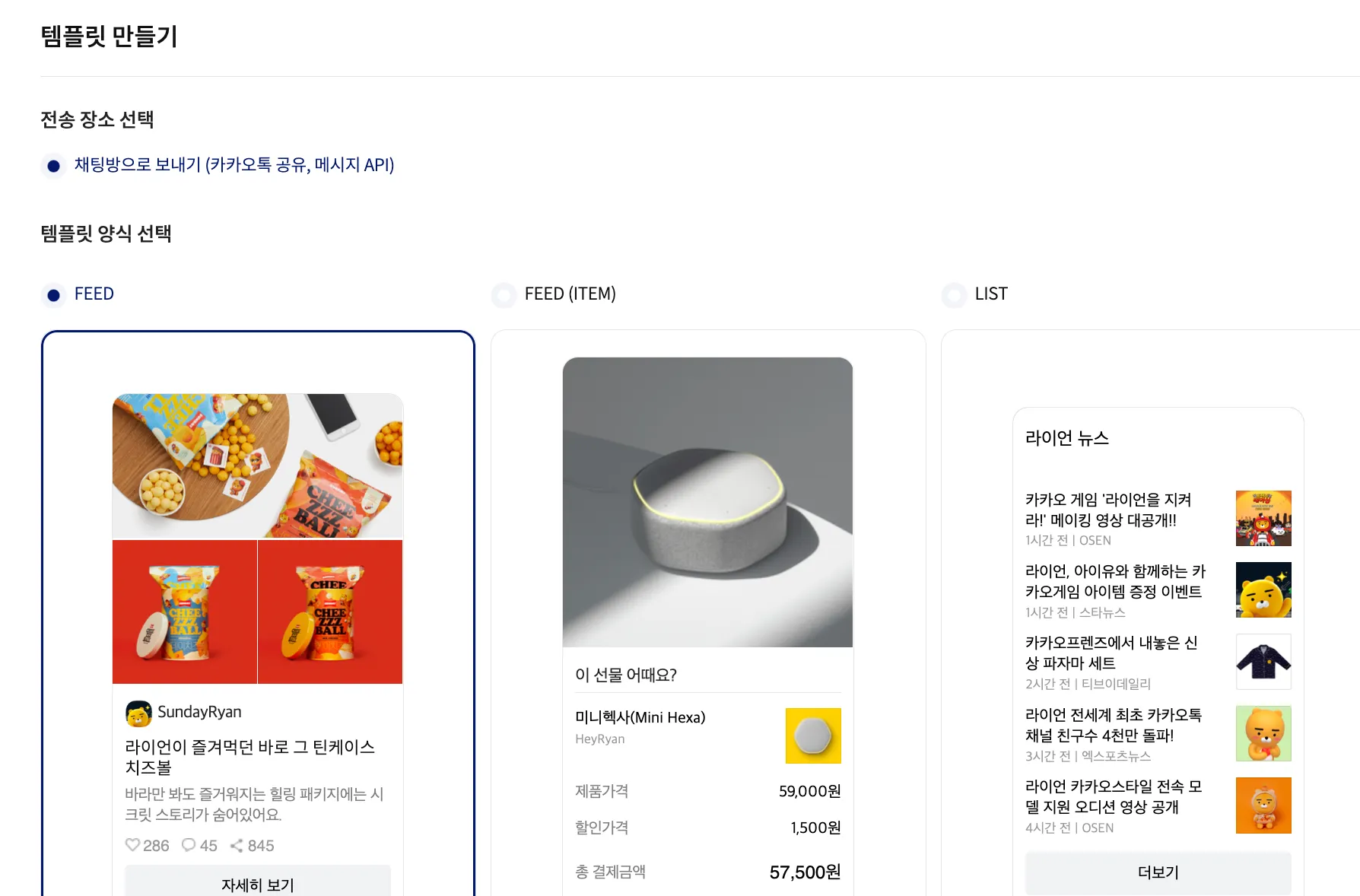 카카오 개발자 계정에서 등록한 템플릿을 활용해 카카오 메시지를 공유할 수 있습니다.