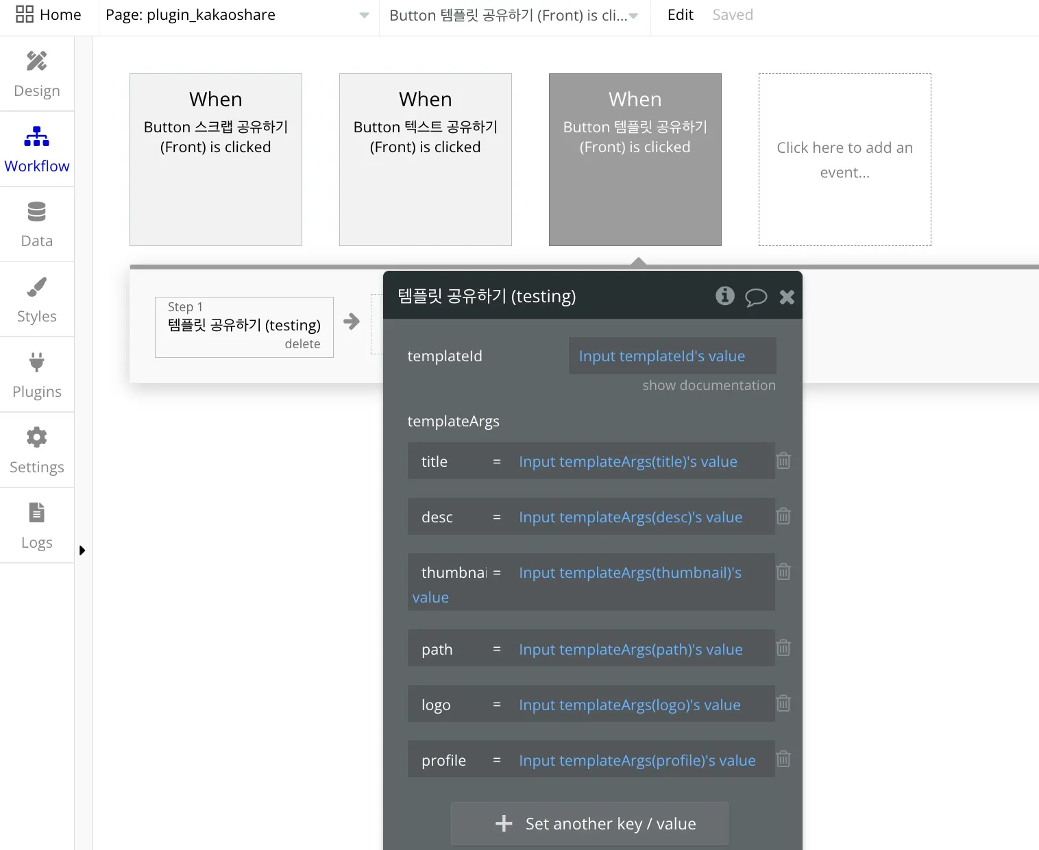 [Workflow] 탭에서 워크플로우를 생성하고, Action Event로 플러그인의 [템플릿 공유하기] 액션을 추가합니다. 각 필드 입력란에 관련 값을 입력합니다.