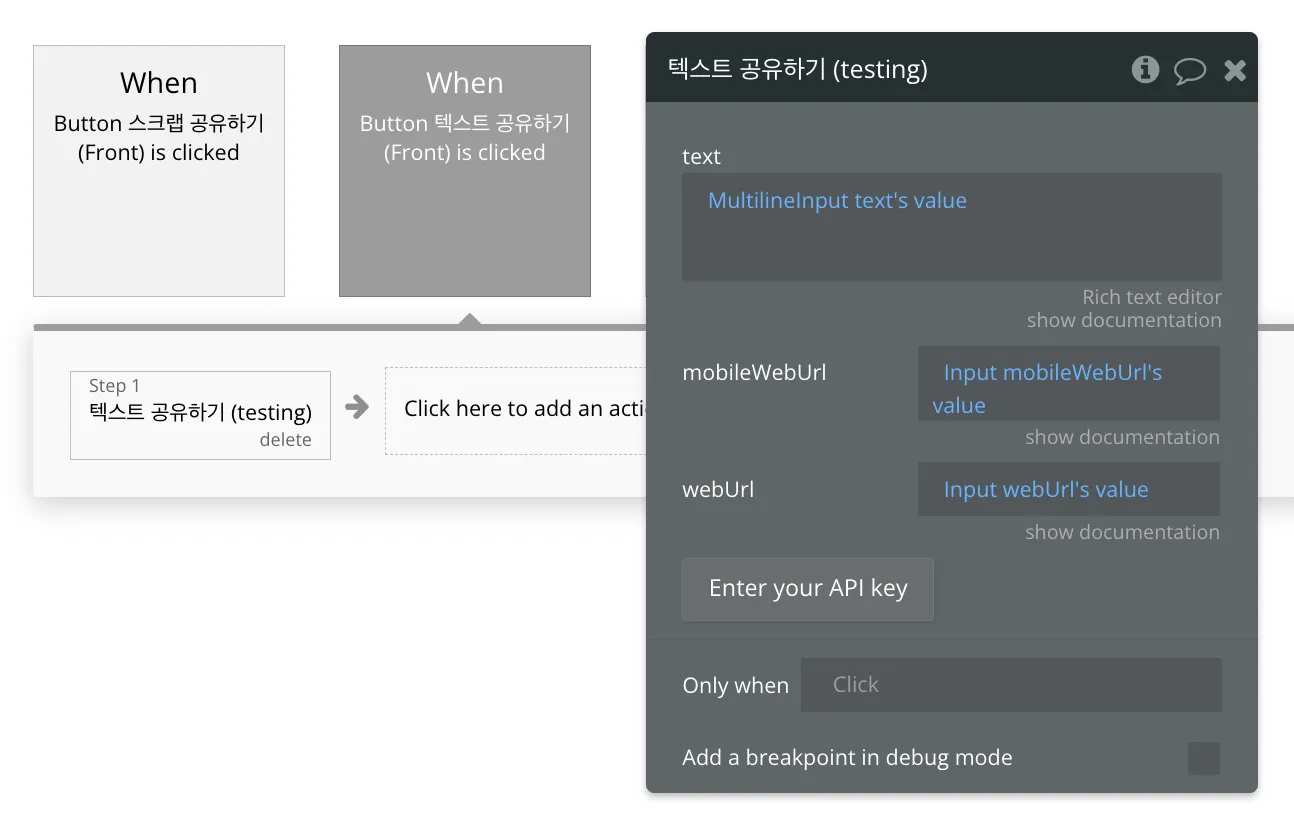 [Workflow] 탭에서 워크플로우를 생성하고, Action Event로 플러그인의 [텍스트 공유하기] 액션을 추가합니다. 각 필드 입력란에 관련 값을 입력합니다.