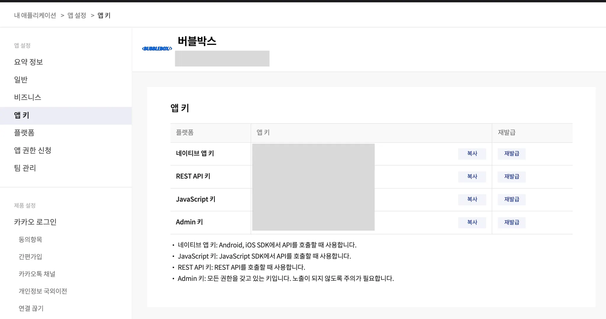 하단 이름 → 카카오 개발자에서 생성한 애플리케이션 이름