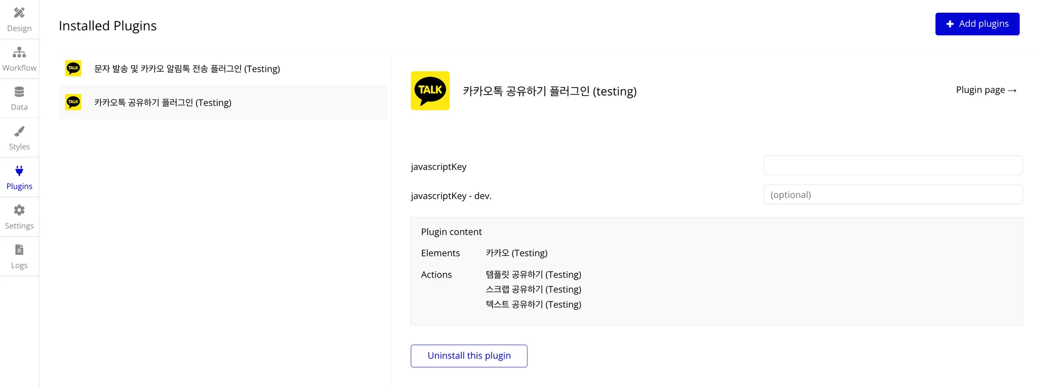 버블 GNB의 [Plugins] 탭에서 플러그인을 클릭합니다. 그리고, javascriptKey 필드에 현재 어플리케이션에 등록된 javascriptKey 값을 붙여넣기 합니다