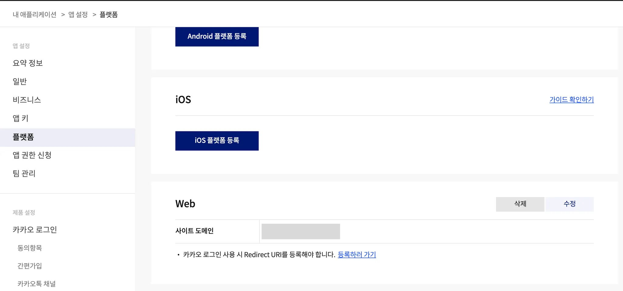 이후, [앱 설정] 영역의 [플랫폼]으로 이동합니다. 여기서 Web을 추가하고, 내 사이트의 도메인을 등록합니다. 도메인 등록 시, 마지막에 “/”를 입력하지 말아주세요