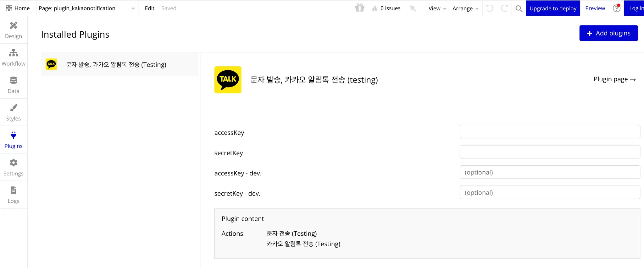 버블 GNB의 [Plugins] 탭에서 플러그인을 클릭합니다. 그리고, accessKey와 secretKey 필드에 앞서 솔라피에서 발급 받은 키 값을 붙여넣기 합니다.