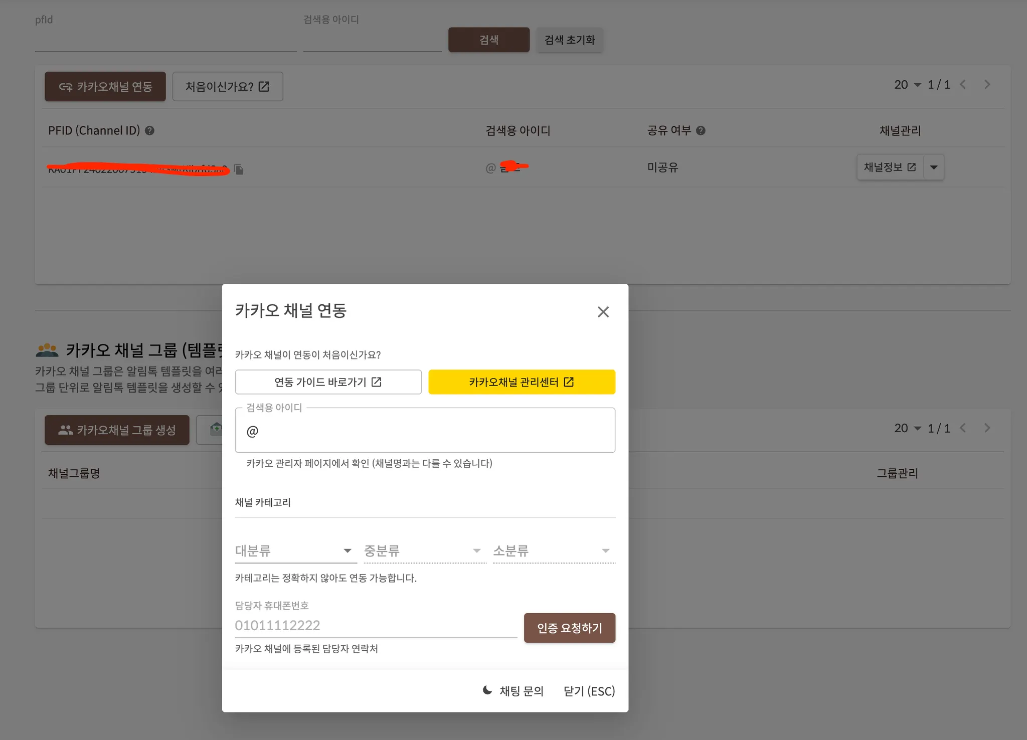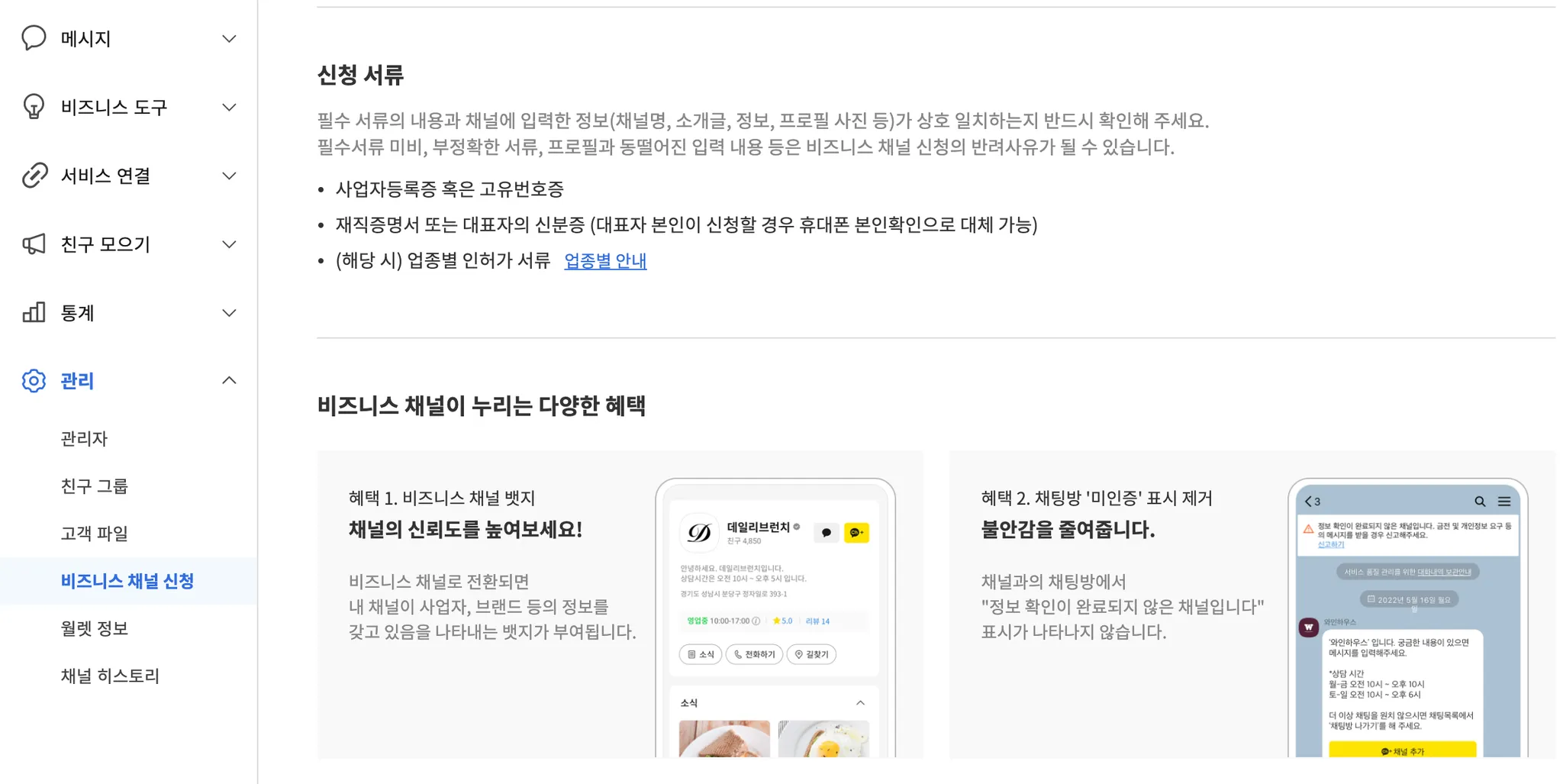비즈니스 채널은 신청 후, 평균 3영업일이 지난 후에 승인이 완료됩니다. 승인 후, 대시보드에서 아래 부분을 추가적으로 작업해주셔야 합니다.