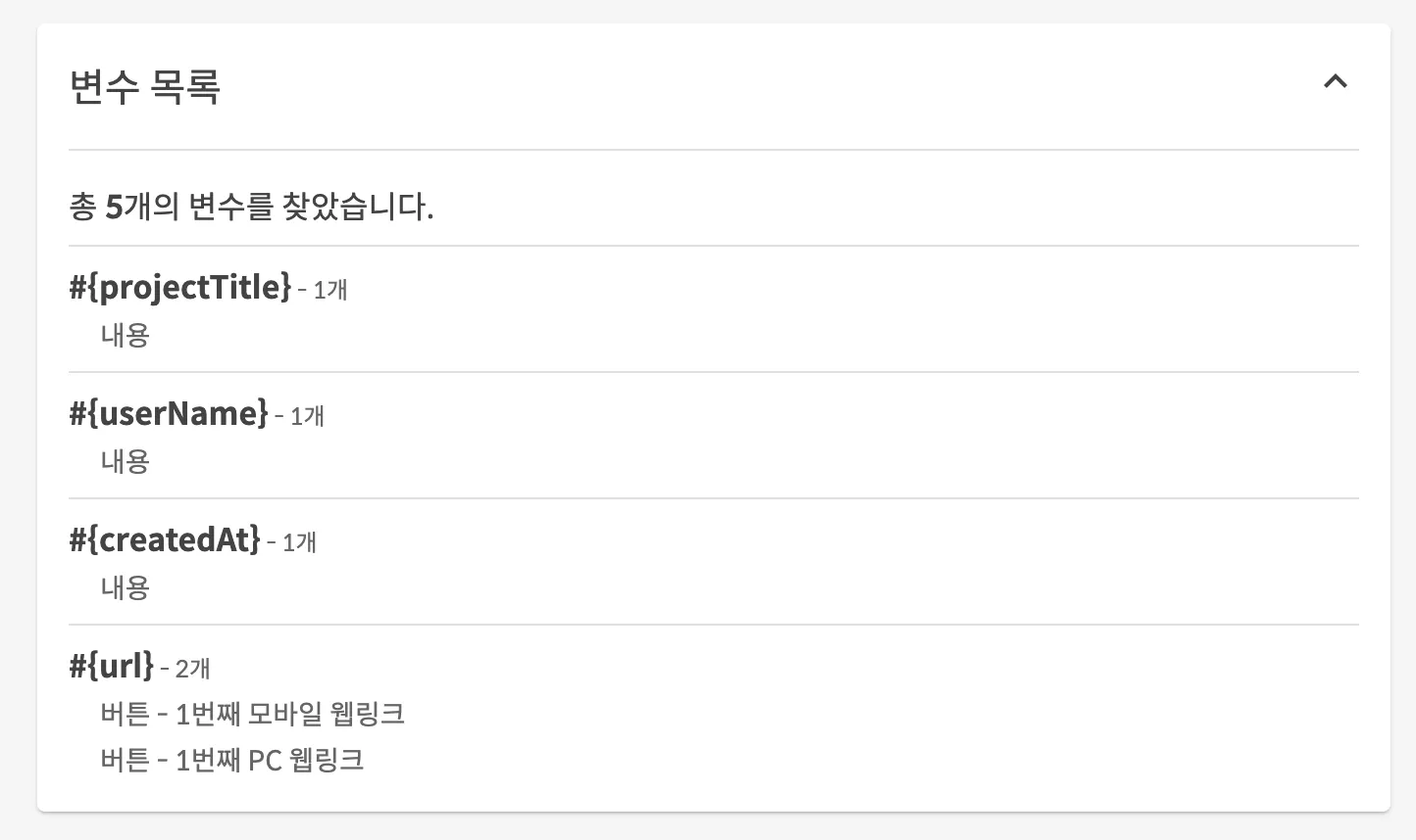 템플릿에 활용한 변수는 하단의 [사용 변수 목록] 섹션에서 확인할 수 있습니다.