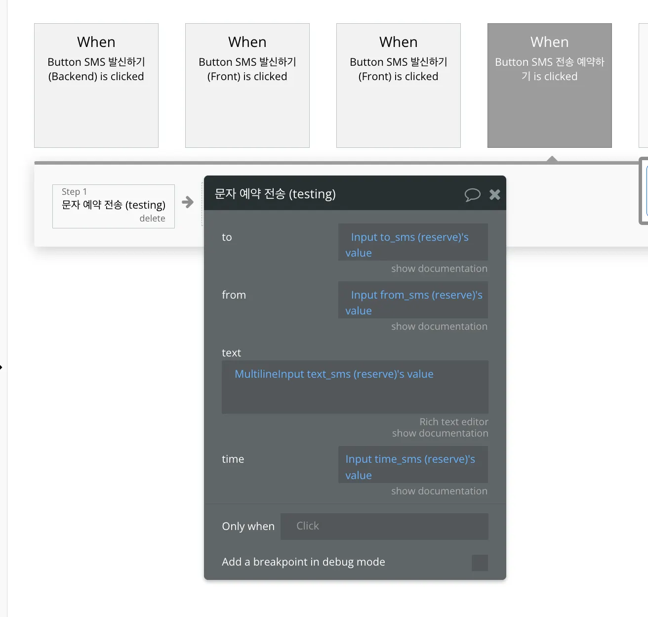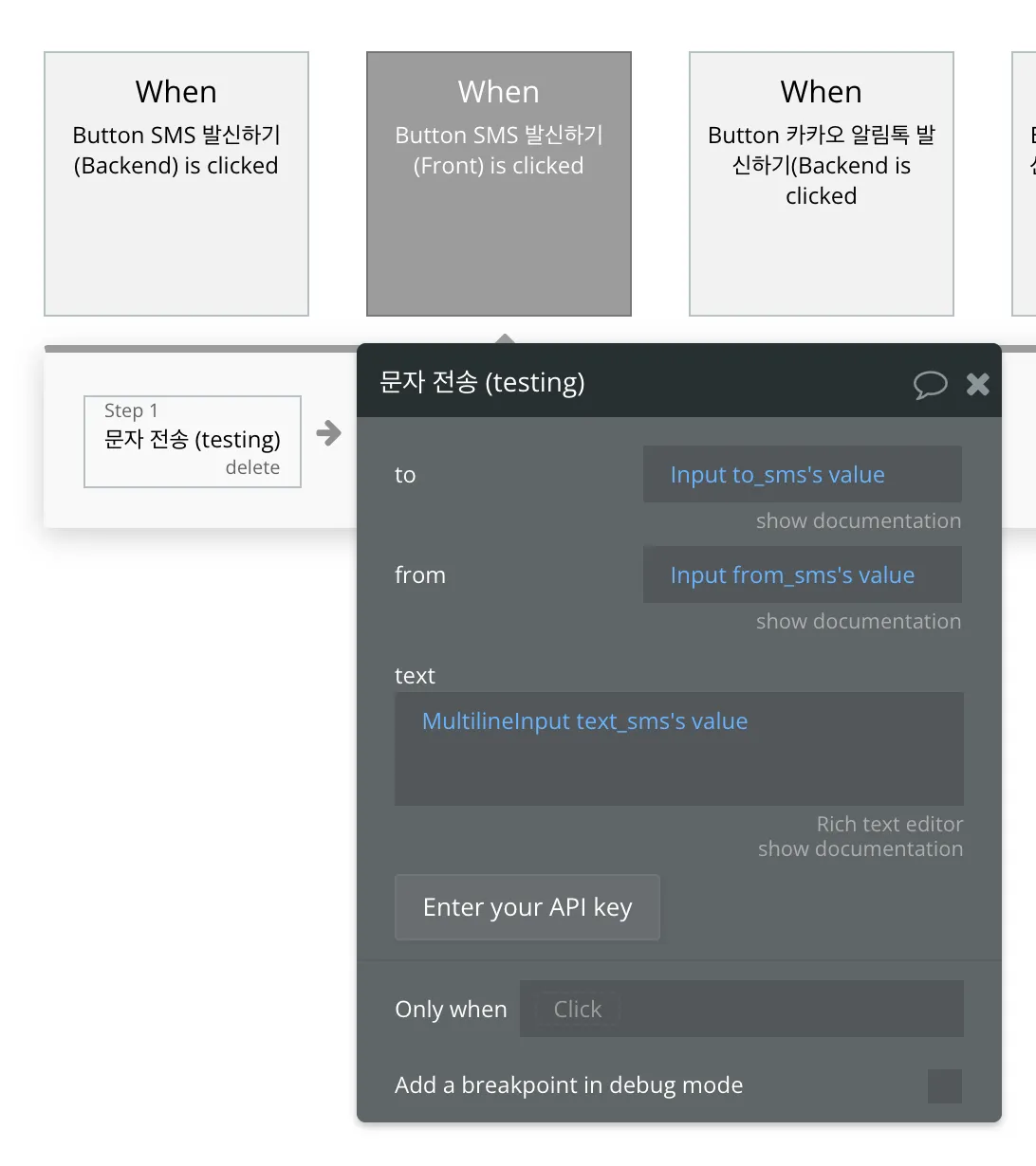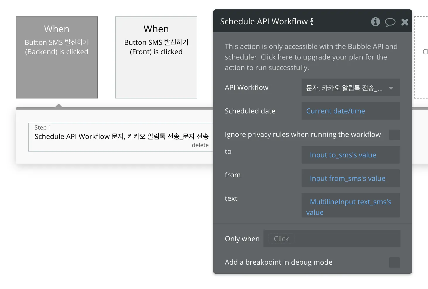 따라서 Backend에서 문자 발송을 처리하는 걸 추천드립니다. Backend workflow는 워크플로우가 클라이언트단이 아닌, 서버단에서 처리 됩니다. 즉, 유저가 페이지를 이탈해도, 백엔드 워크플로우는 그대로 작동이 됩니다.