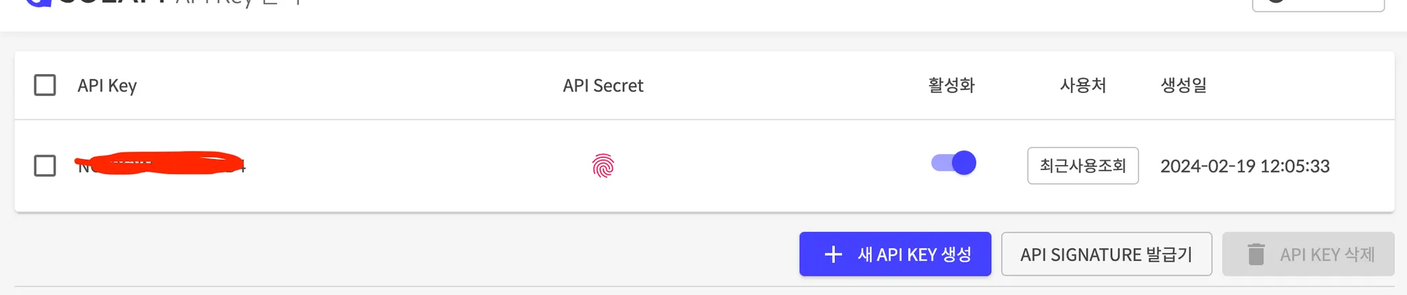 마지막으로 [연동/자동화] 영역에 있는 [API Key]를 들어갑니다. 여기서 새로운 Key를 발급합니다. API Key와 API Secret Key가 모두 필요합니다. 만약 앞선 문자 발송을 위해 API Key를 발급 받았다면, 새로운 API key를 발급 받을 필요가 없습니다.