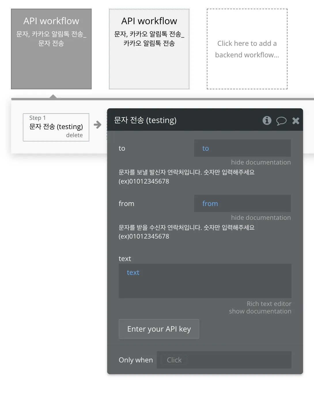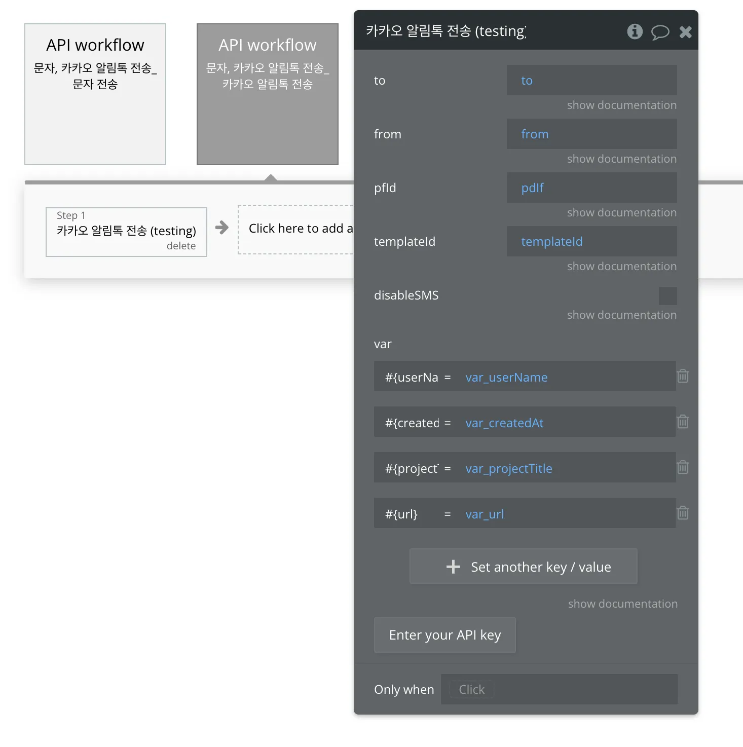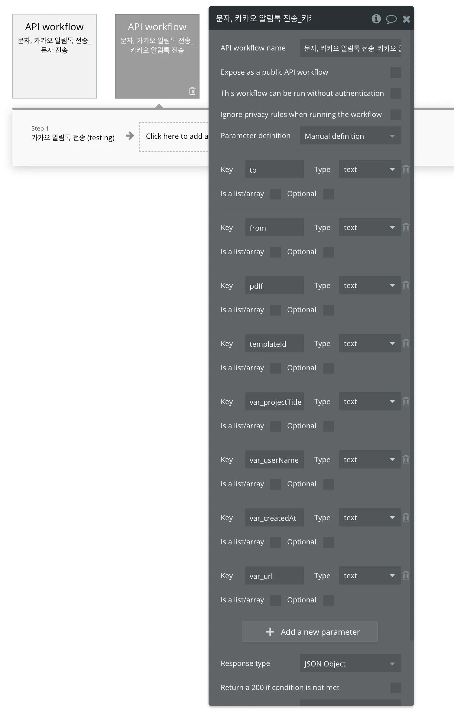 백엔드 워크플로우를 생성할 때, 알림톡에 사용한 변수 목록에 맞춰서 파라미터를 설정합니다.