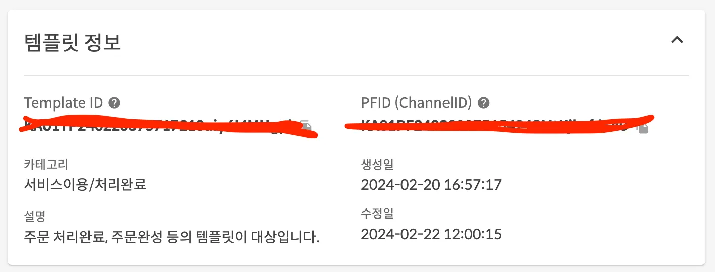 모든 템플릿 정보를 입력했으면, 템플릿 심사를 요청합니다. 템플릿 승인까지 약 1~3 영업일이 소요됩니다. 템플릿 승인이 완료되면, 해당 템플릿의 [템플릿 정보] 섹션에서 템플릿 ID(templateId)와 채널 ID(pfId)를 확인할 수 있습니다.
