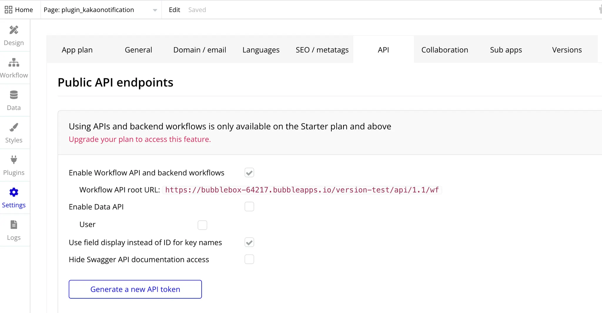[Settings]의 [API] 탭으로 이동하고, [Enable workflow API and backend workflows]를 활성화 합니다.