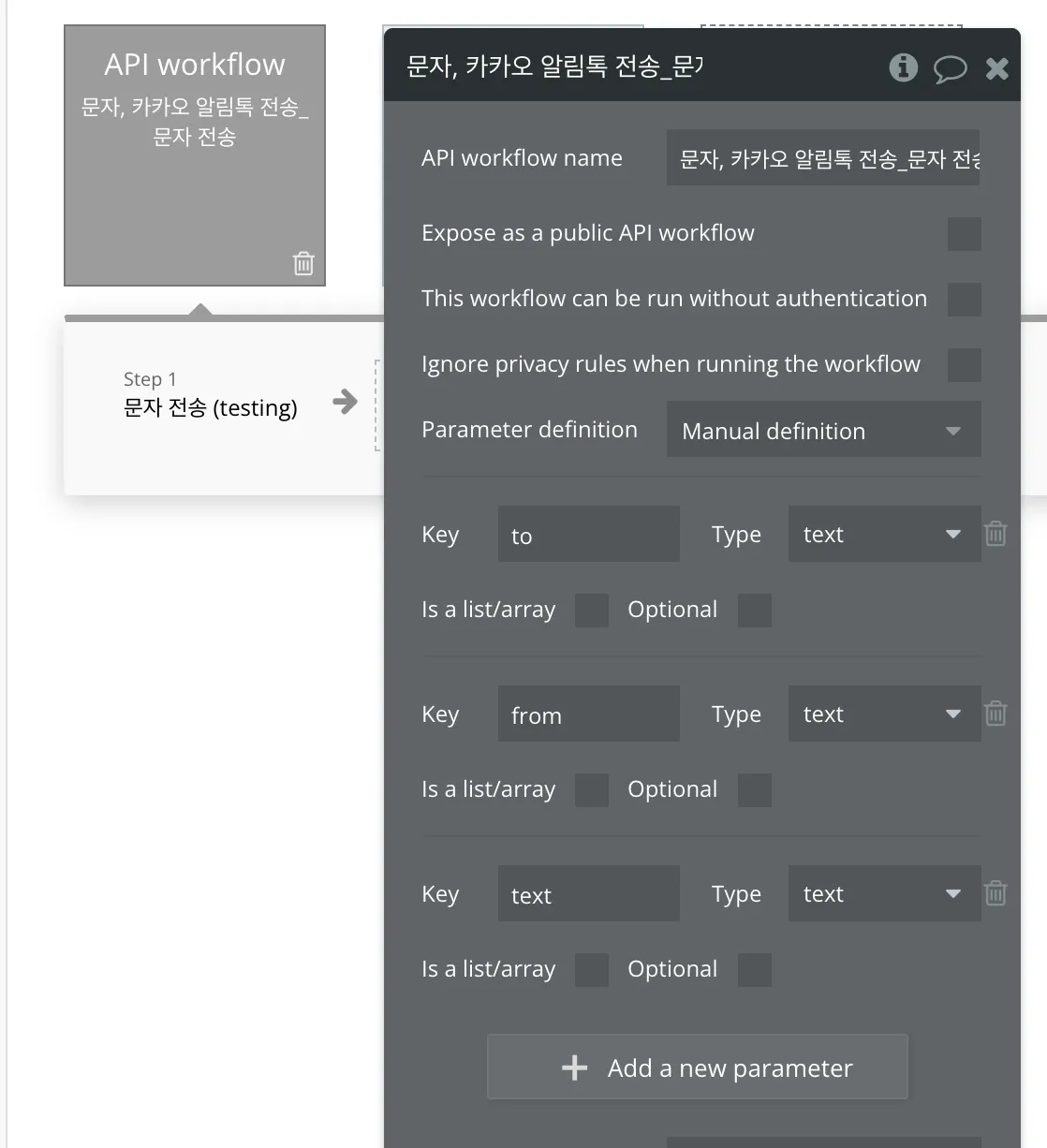 [New API workflow]를 클릭해 새로운 백엔드 워크플로우를 생성합니다. 그리고 아래처럼 전달 받을 파라미터 이름과 값을 추가합니다. 해당 파라미터는 프론트 워크플로우에서 전달 용도로 사용됩니다.