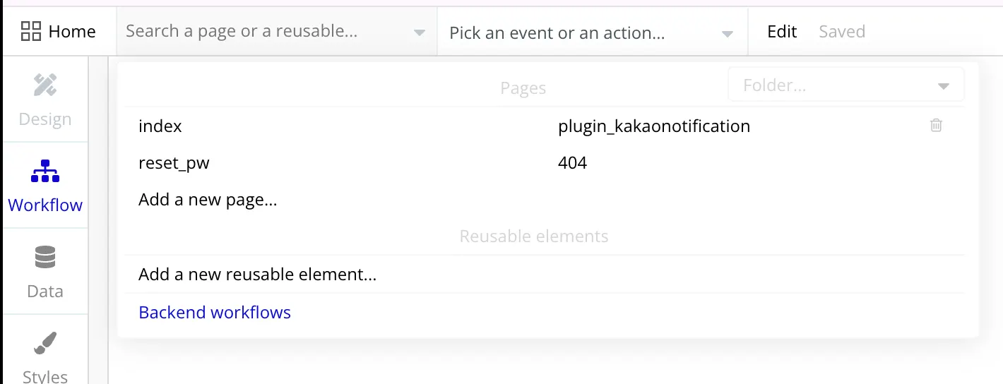 생성한 백엔드 워크플로우에 플러그인의 [카카오 알림톡 전송] 액션을 추가합니다.