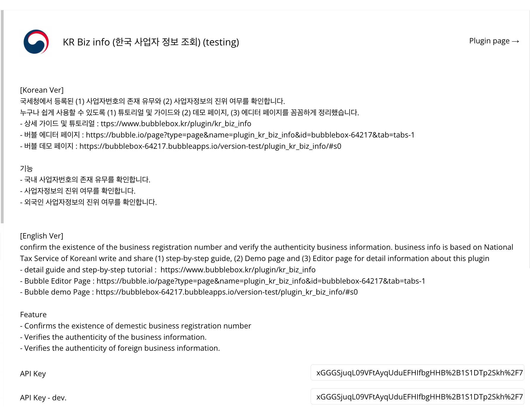 본 플러그인은 국세청에서 제공하는 API를 활용하며, 대한민국 국세청에서 조회 가능한 사업자만 확인 가능합니다.