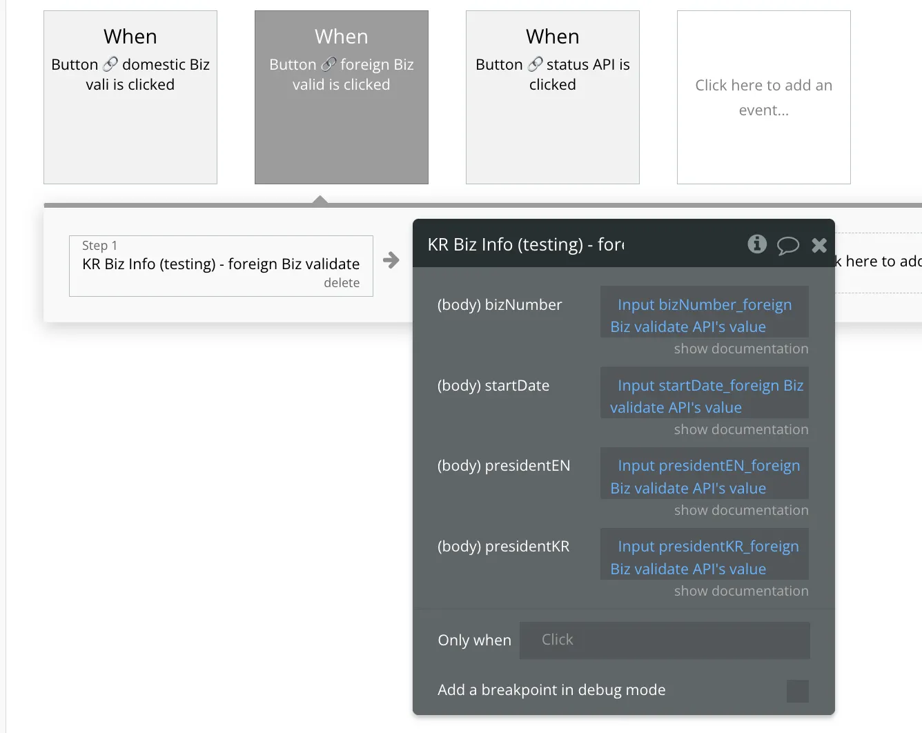 외국인 사업자의 경우, [KR Biz info - foregin Biz validate]를 사용해야 합니다. 워크플로우에서 [KR Biz info - foregin Biz validate]를 생성하고 [bizNumber] 필드에 사업자번호를 입력합니다. 이때 사업자번호는 하이폰 같은 특수문자 없이 숫자 10자리만 입력합니다. [startDate]에는 사업자 개업일을 YYYYMMDD 형식으로 입력합니다. [presidentEN]에 사업자 대표의 영어 이름을 입력하고, [presidentKR]에 사업자 대표의 한글 이름을 입력합니다.