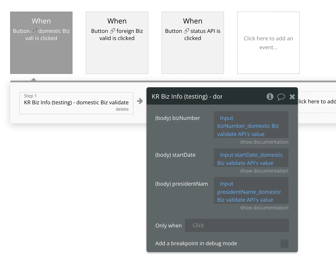 Create a [KR Biz info - domestic Biz validate] workflow action. Input the business registration number without any special characters, only 10 digits, in the [bizNumber] field. Input the business opening date in YYYYMMDD format in the [startDate] field, and input the name of the business representative in the [presidentName] field.