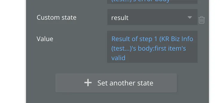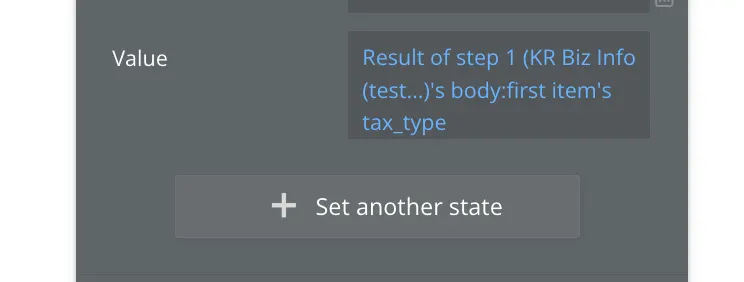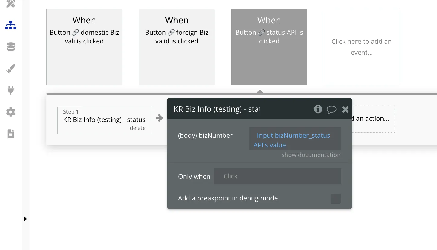 Create a [KR Biz info - status] workflow action. In the [bizNumber] field, input the business registration number without any special characters, only 10 digits.