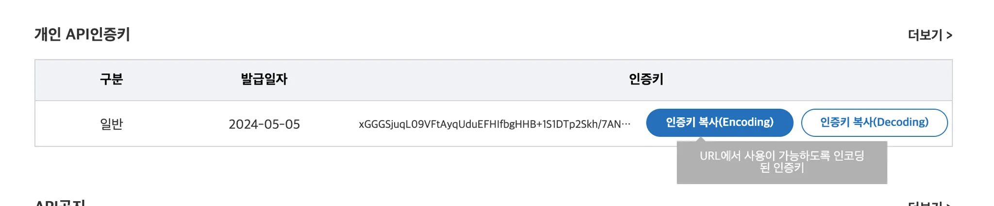 활용 신청이 완료되면, 이제 [마이페이지]로 이동하고 현재 API Key를 확인합니다. [인증키 복사(Encoding)]을 클릭합니다.