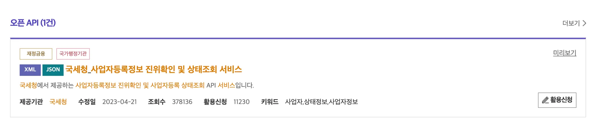 [국세청_사업자등록정보 진위확인 및 상태조회 서비스]를 검색합니다. 그리고 오픈 API에서 [활용신청] 버튼을 클릭합니다.