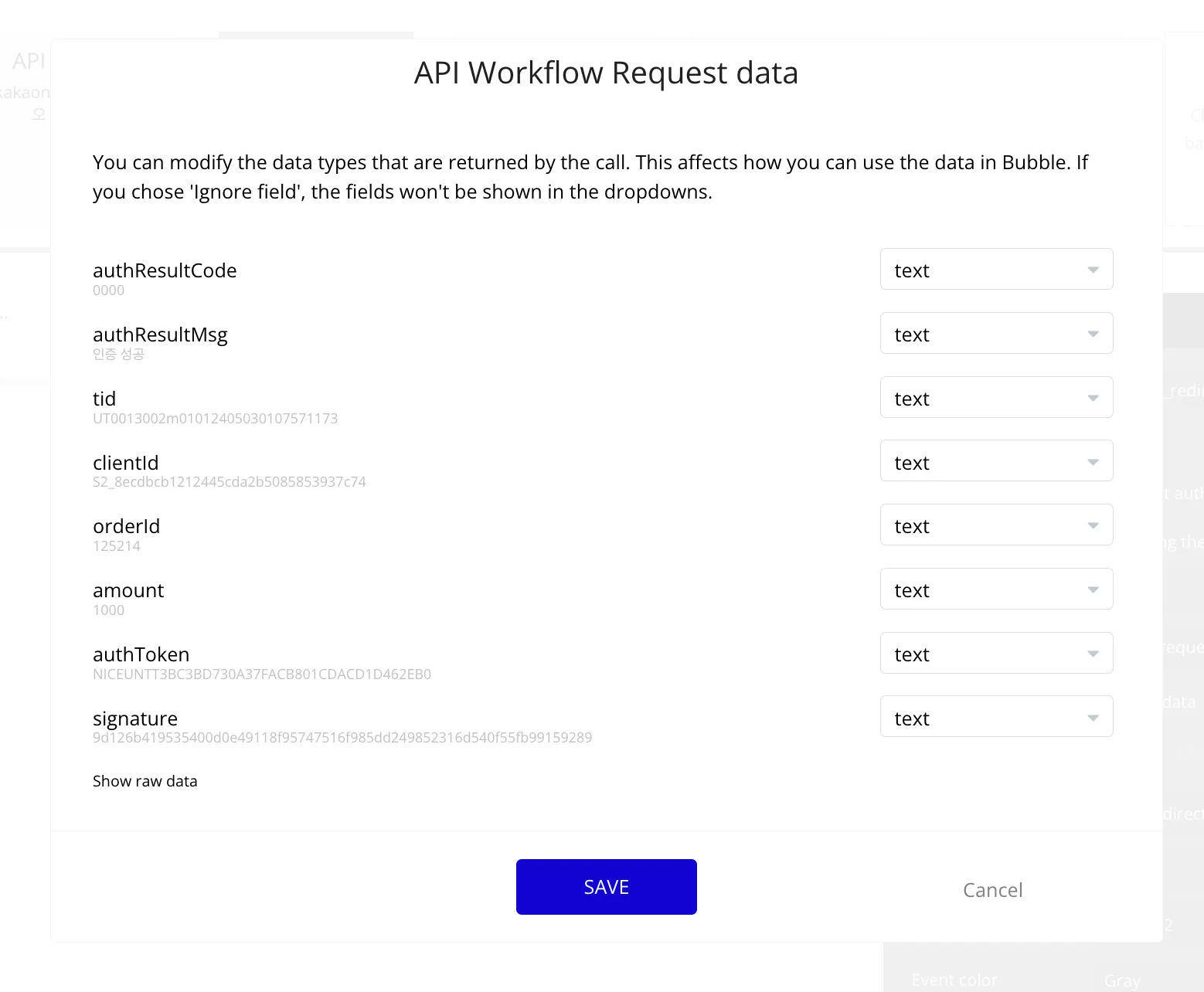 그러면 닫지 않은 팝업 창에서 아래와 같이 변경됩니다. 보여지는 데이터 형식은 나이스페이가 보내준 결제 인증 결과입니다. [save] 버튼을 클릭해 결과 값의 데이터 형식을 저장합니다.