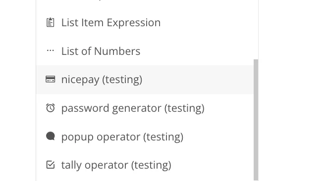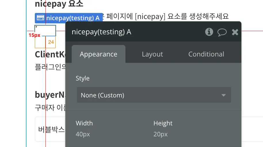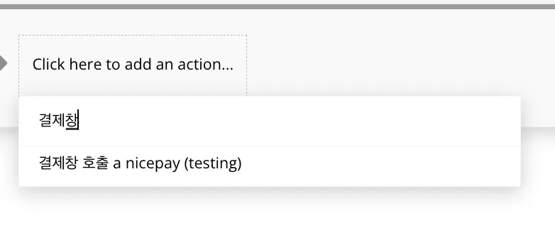 결제창을 호출하고 싶은 페이지에 [nicepay] 요소를 생성합니다. 그러면 워크플로우에서 [결제창 호출] 액션을 사용할 수 있습니다.