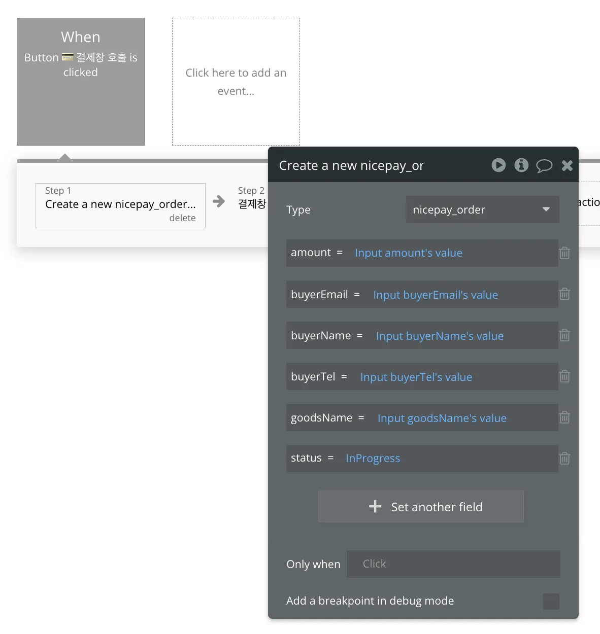 결제 버튼을 생성하고, 버튼을 클릭하면 실행하는 워크플로우를 추가합니다. 해당 워크플로우에서 결제 테이블에 새로운 레코드를 생성하는 액션을 추가합니다. 그리고 [status]는 “진행 중” 값으로 설정합니다. 추후에 결제 요청 및 승인에 따라서 해당 값을 “완료”나 “실패”로 변경 처리를 할 겁니다. 이를 통해 각각의 결제가 어떤 상태인지 파악할 수 있습니다.