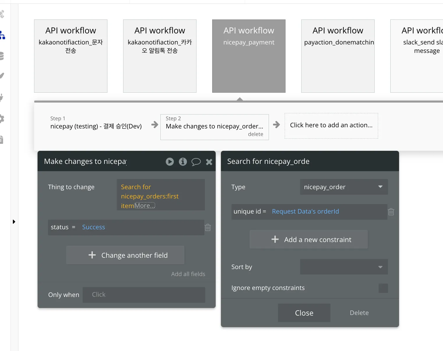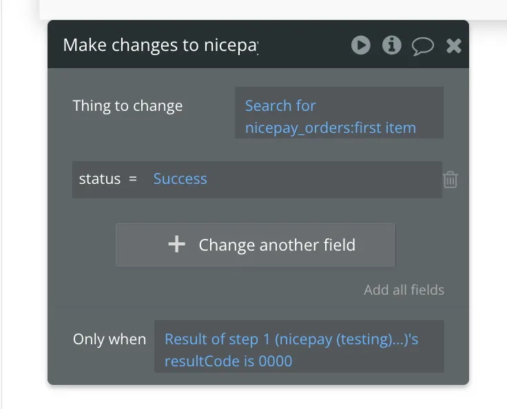 결제 승인까지 성공적으로 완료됐으면, 결제 테이블에서 해당 레코드 상태를 “성공”으로 변경해줘야 합니다.[make change a thing] 액션을 추가합니다. 그리고 [do a search for]을 활용해 [결제 테이블]을 불러옵니다. 앞선 승인 결과 값의 [orderId]를 활용해 유저의 결제를 찾고, 상태를 “성공”으로 변경합니다.
