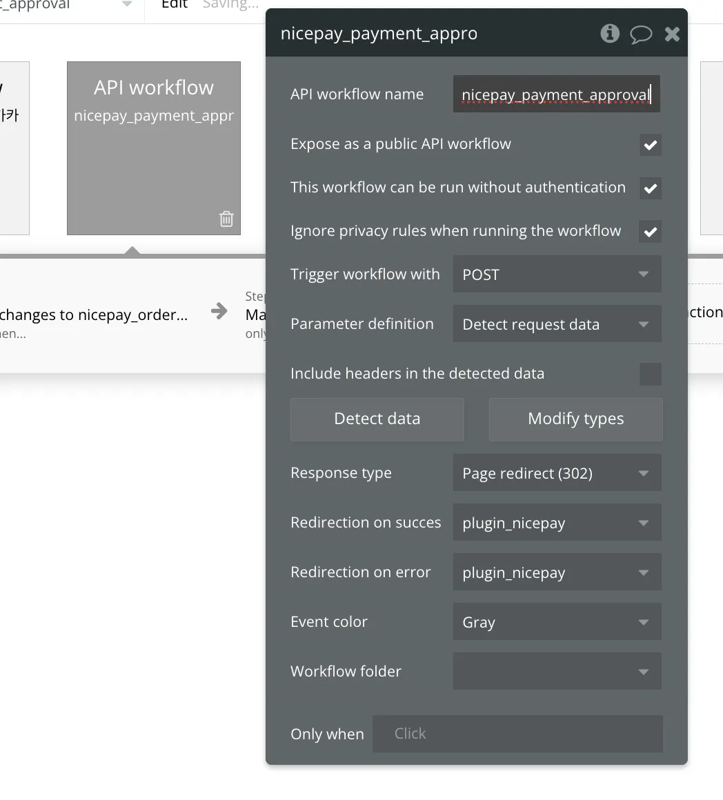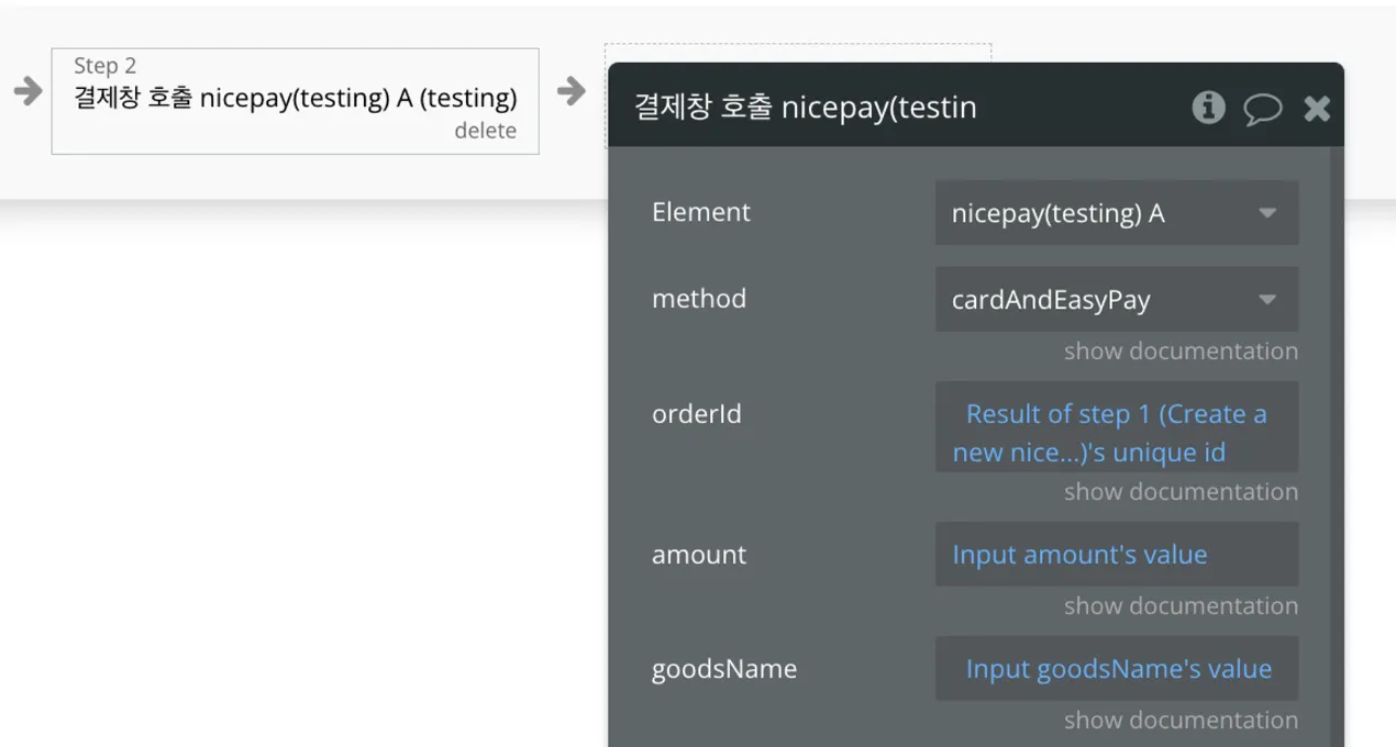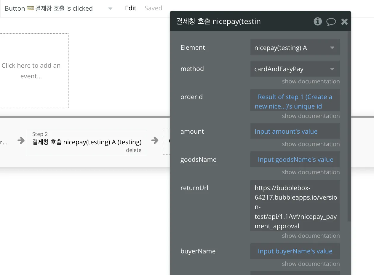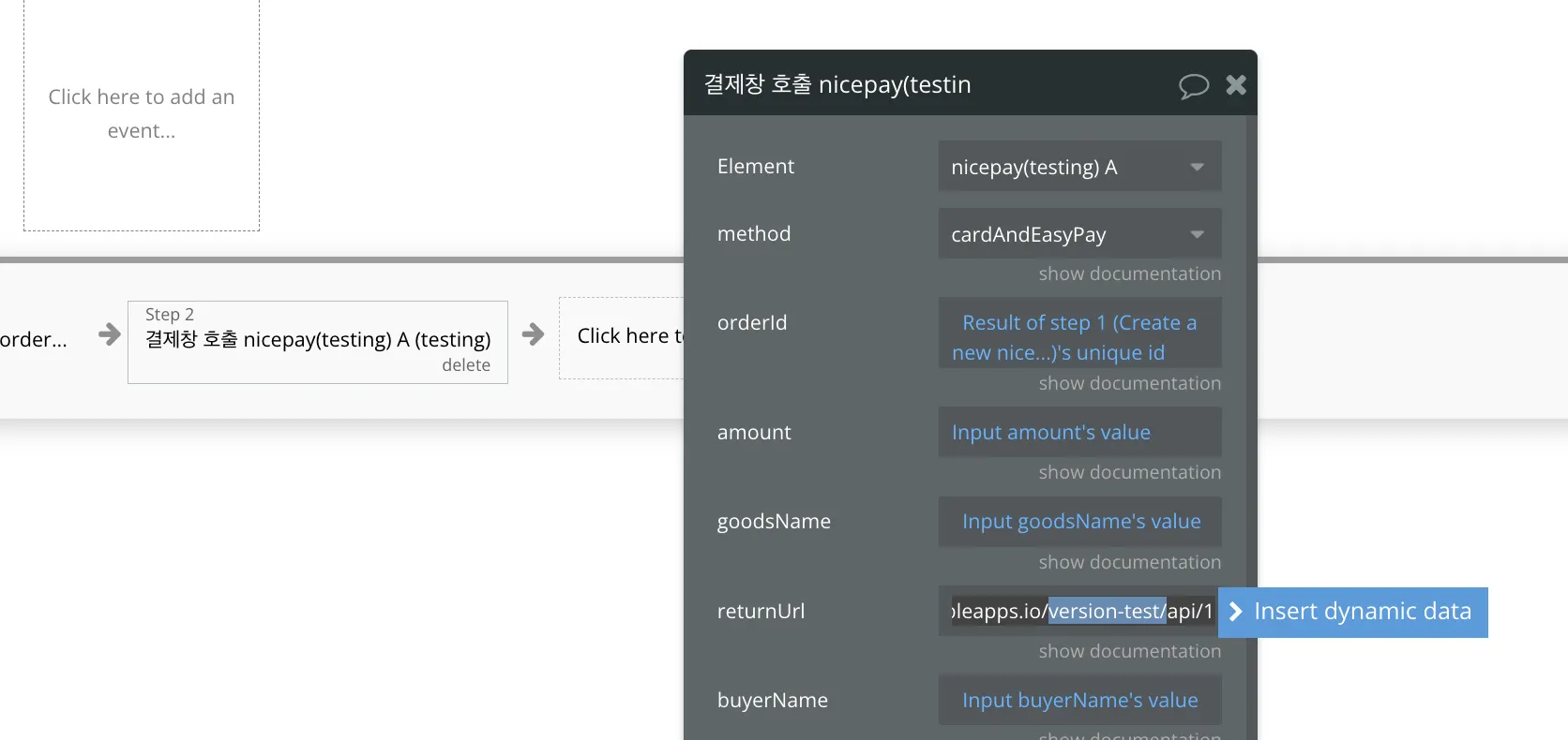 그 다음으로 [결제창 호출] 액션을 추가하고, 관련 값을 입력합니다. 여기서 [orderId]는 결제 테이블의 unique Id 값을 사용하는 게 좋습니다. 그래야 각 결제의 레코드에 고유성을 보장하고, 나이스페이와 버블 DB에서 동일한 결제 번호로 쉽게 관리할 수 있습니다.