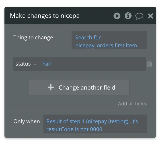 단, 위와 같은 설정만 한다면 승인이 실패되도, 주문 테이블에서 “성공” 처리가 될 수 있습니다. 이를 막기 위해 [Only when]에서 승인 결과 값의 [resultCode] 값을 활용합니다. 승인이 성공되면 해당 코드는 “0000”이 반환됩니다. 같은 방식으로 승인 처리가 실패 됐을 때, resultCode 값을 활용해 주문 인스턴스의 상태를 “실패”로 변경하는 액션을 생성합니다.