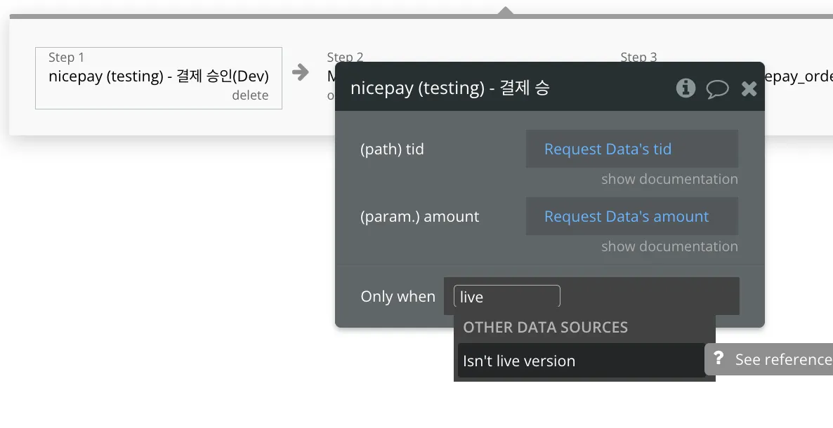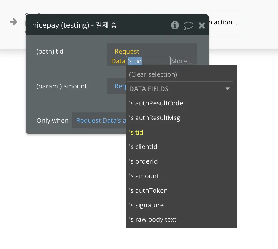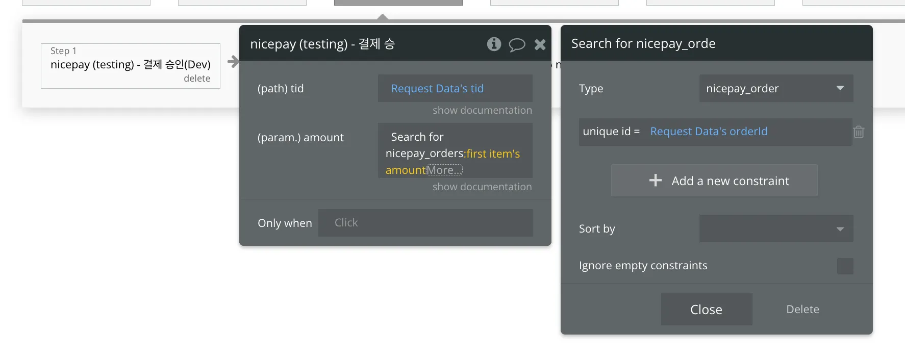 이제 결제 인증 값을 확인했으니, 이를 기반으로 결제 승인을 요청해야 합니다. 결제 승인을 요청하기 위해서 (1) 인증 결과값으로 넘어온 tid와 (2) 결제 금액을 전달해야 합니다. 앞선 백엔드 API에서 [nicepay - 결제 승인(Dev)] 액션을 추가하고, [tid] 필드에 인증 결과 값의 tid를 입력합니다. 그리고 [Do a search for]로 [결제 테이블]를 불러오고, [unique id] 필드에 인증 결과 값의 orderId를 활용해 확인한 결제 금액을 [amount] 필드를 입력합니다.