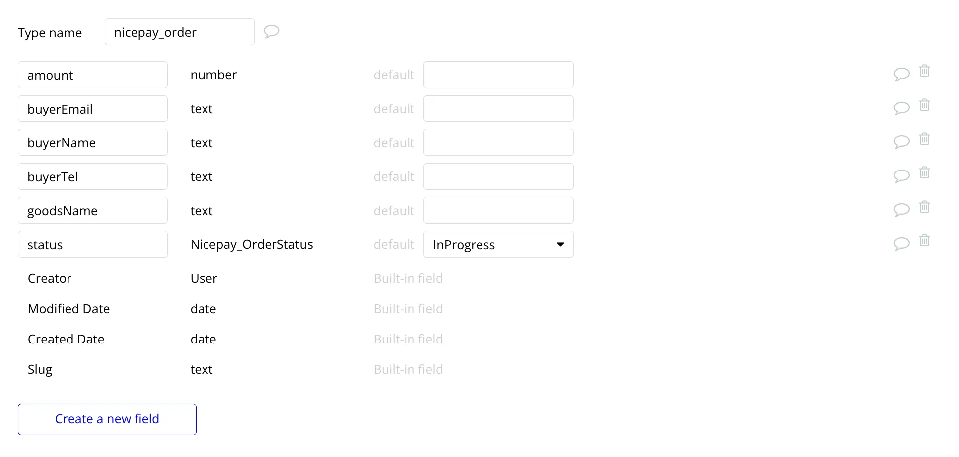 결제 테이블을 만들고, 관련 정보를 저장할 수 있는 필드를 추가합니다. 이때, 아래 이미지의 [status] 필드처럼 주문 레코드의 상태 값을 나타낼 수 있는 필드를 추가합니다. 해당 필드 값을 업데이트해서 결제가 성공적으로 완료됐는지를 보여줄 겁니다.