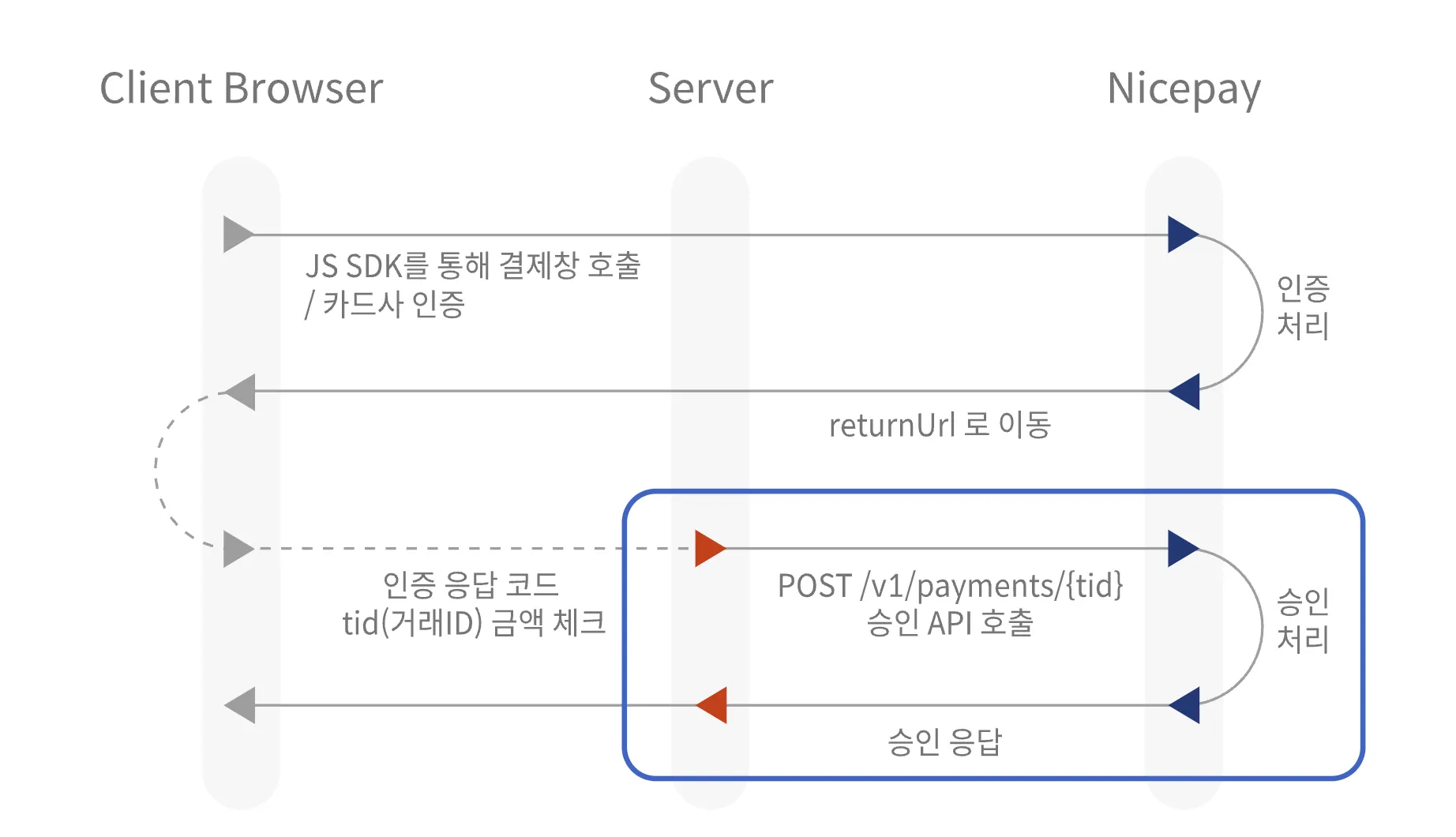 인증이 성공적으로 완료다면, 다시 결제 승인 처리를 나이스페이에게 요청합니다.