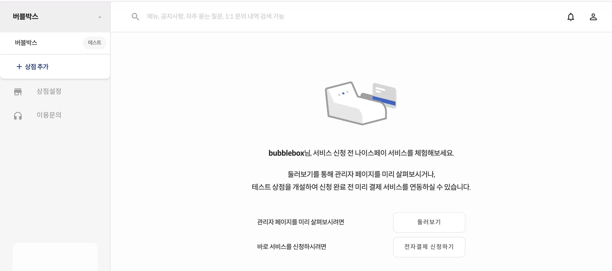 나이스페이에 회원가입을 합니다. 그리고 테스트 상점을 개설합니다. 심사를 접수 및 통과해야 실 상점이 개설됩니다. 그전까지는 실제 거래가 이루어지지 않는 테스트 결제창만 연동할 수 있습니다.
