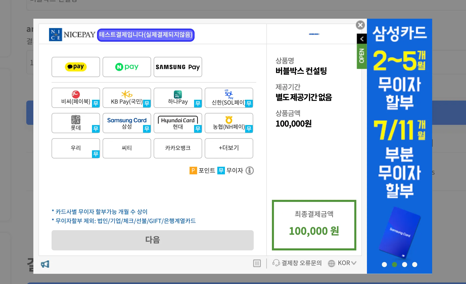설정 값을 올바르게 했으면, 아래처럼 결제창이 호출됩니다.