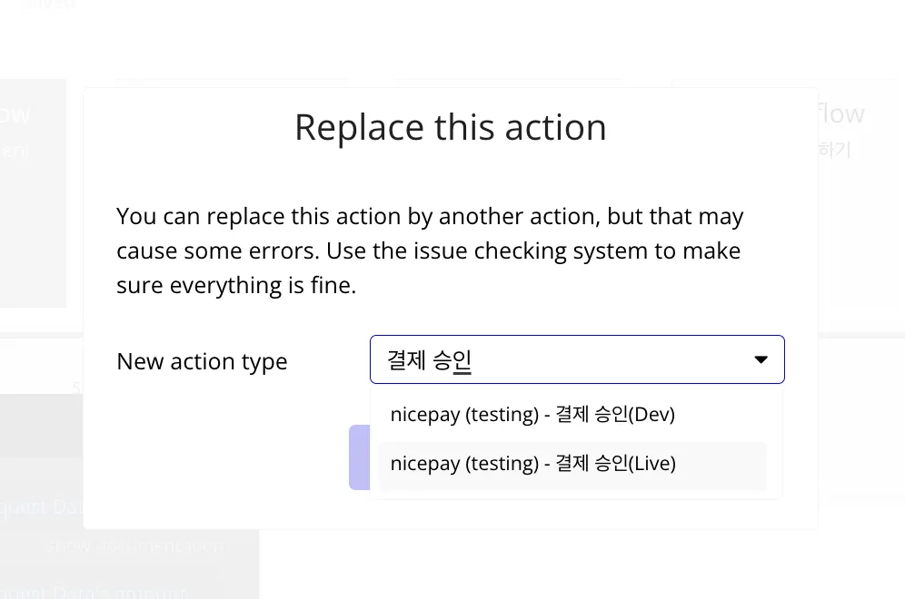 [결제 승인(Dev)] 액션을 [결제 승인(Live)]로 변환