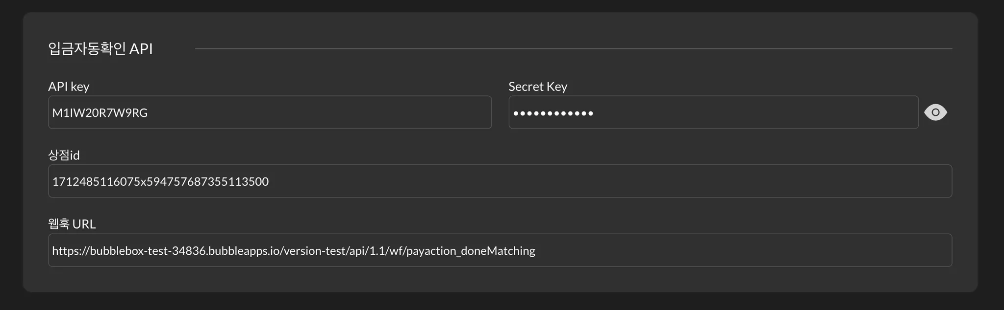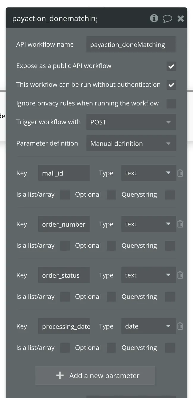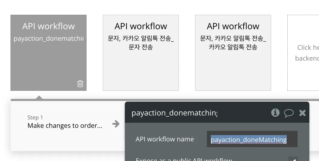 이제 매칭이 완료될 때마다, 버블에서 작동시킬 로직을 만들면 됩니다. 앞서 만든 백엔드 API에서 아래와 같이 설정을 진행합니다. 그래야 웹훅에서 전달 받은 데이터를 확인할 수 있습니다.